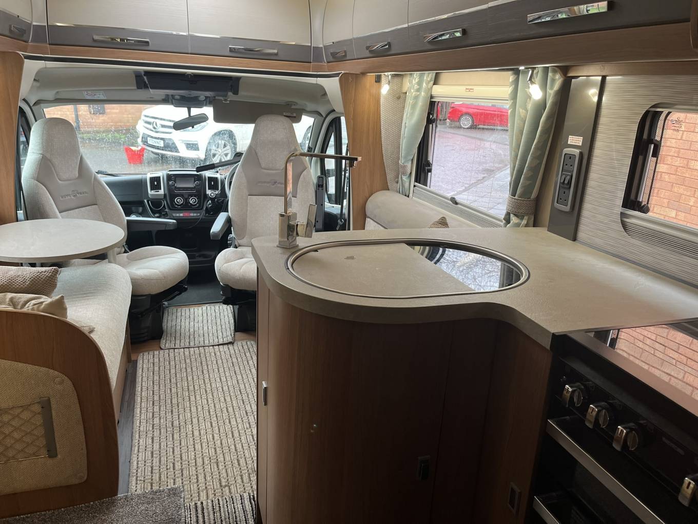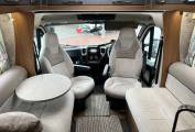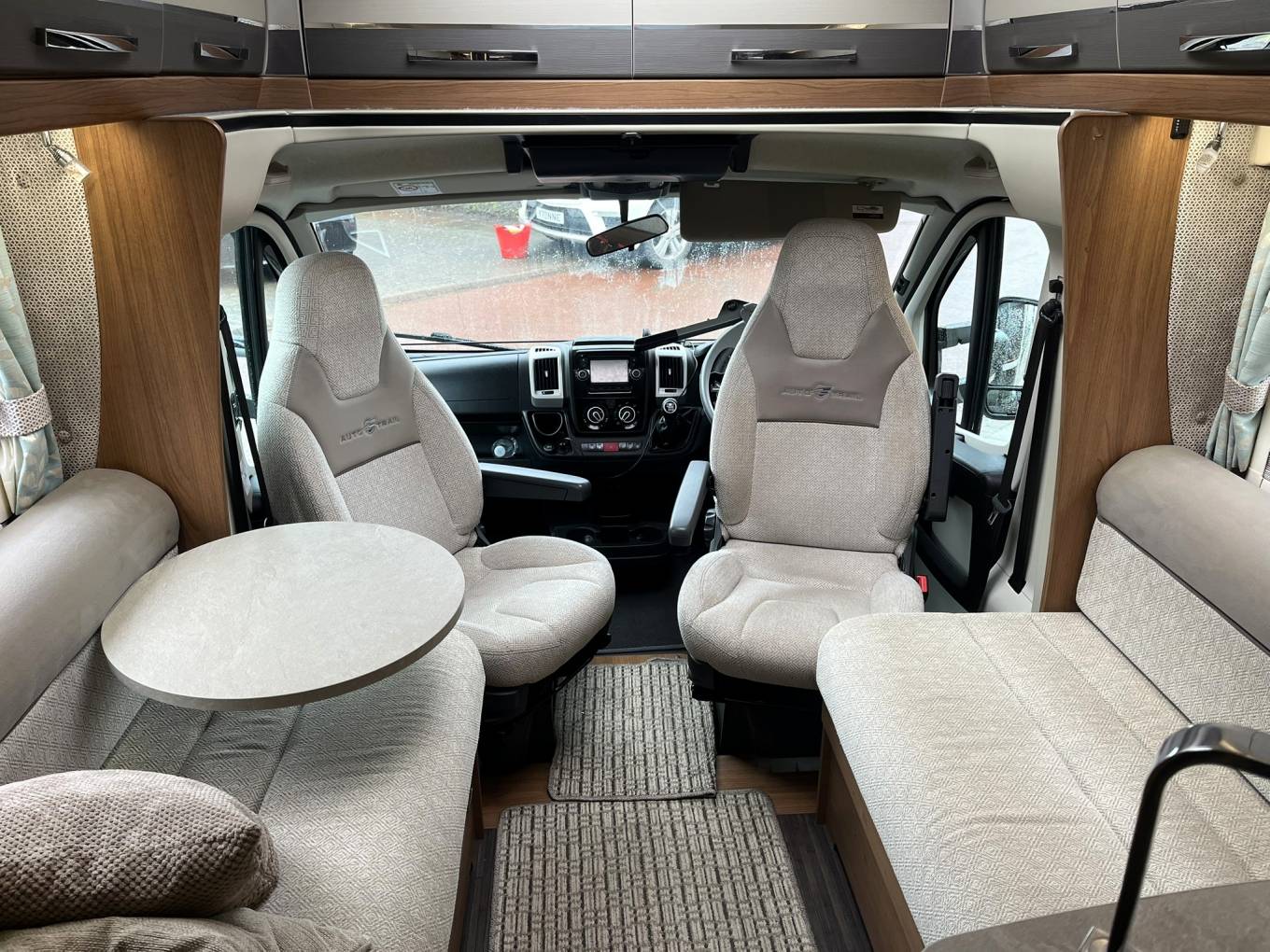 Living space - Large Skylight makes this a bright space, two bench style sofas, round coffee/lap top table, Free-Standing dining table- can also be used outside, plenty of high level lockers, control panel for the ultra efficient ALDE (water) heating system.