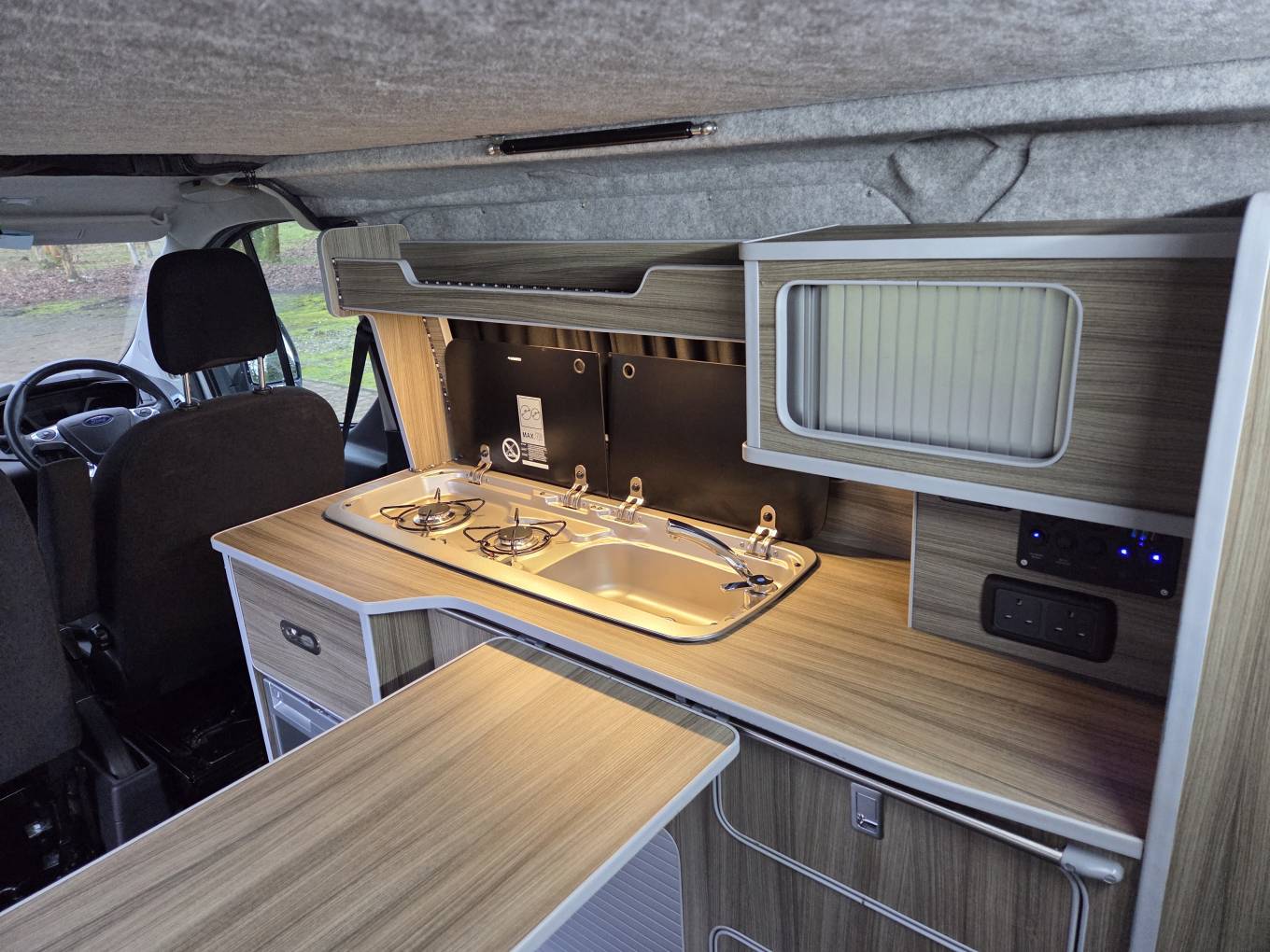 Kitchen: Integrated two burner gas hob with sink. Dometic 12v fridge/freezer.