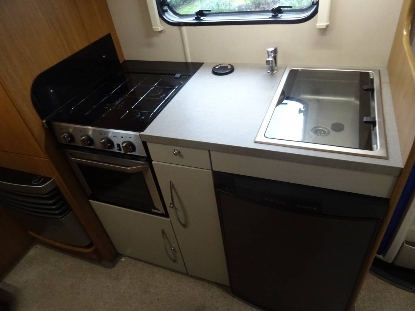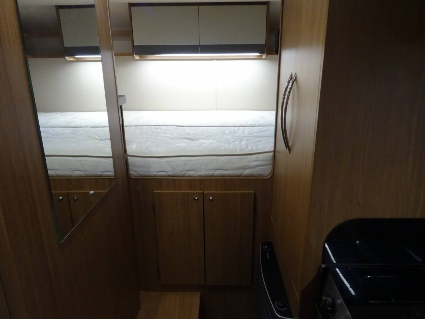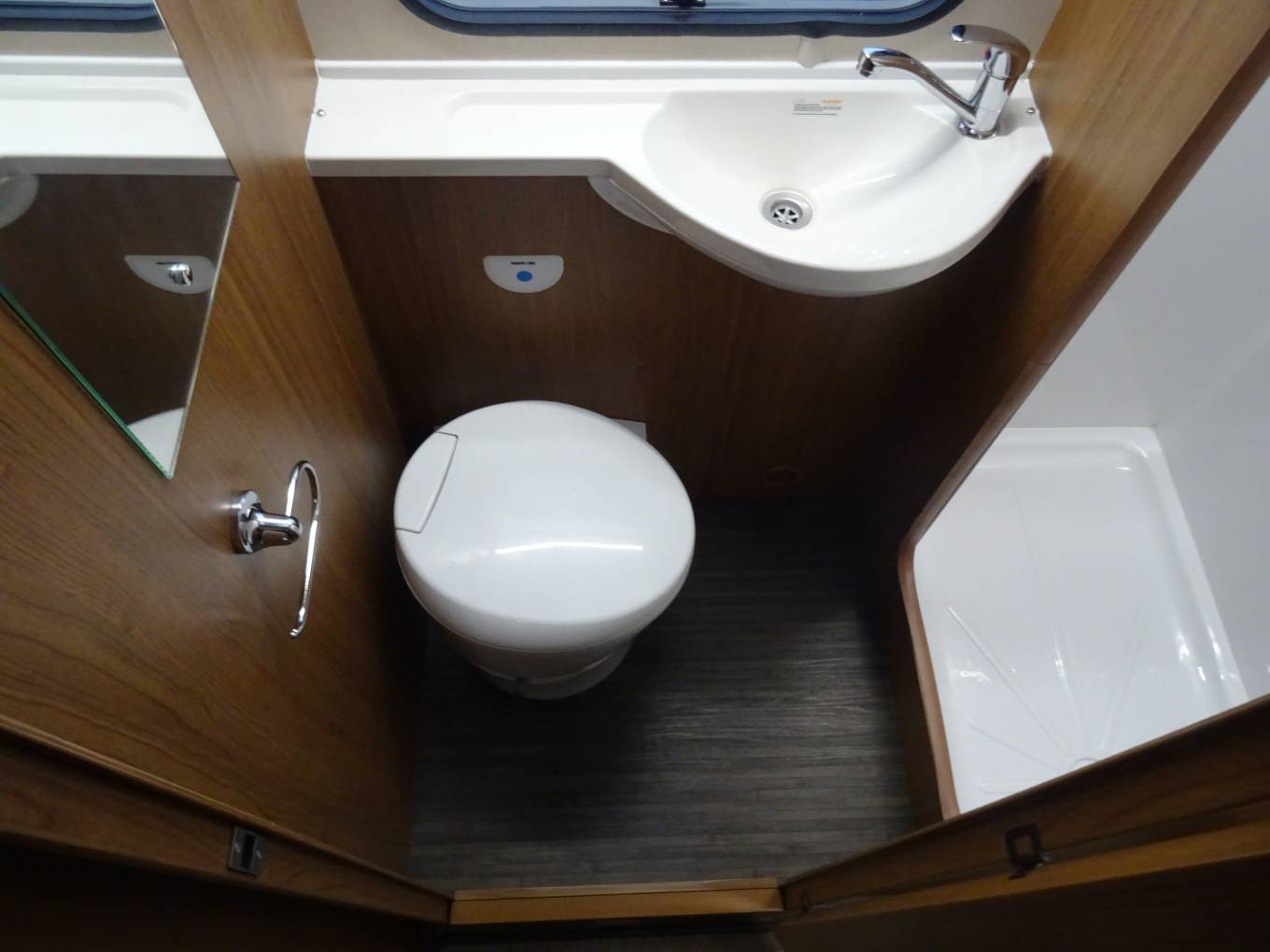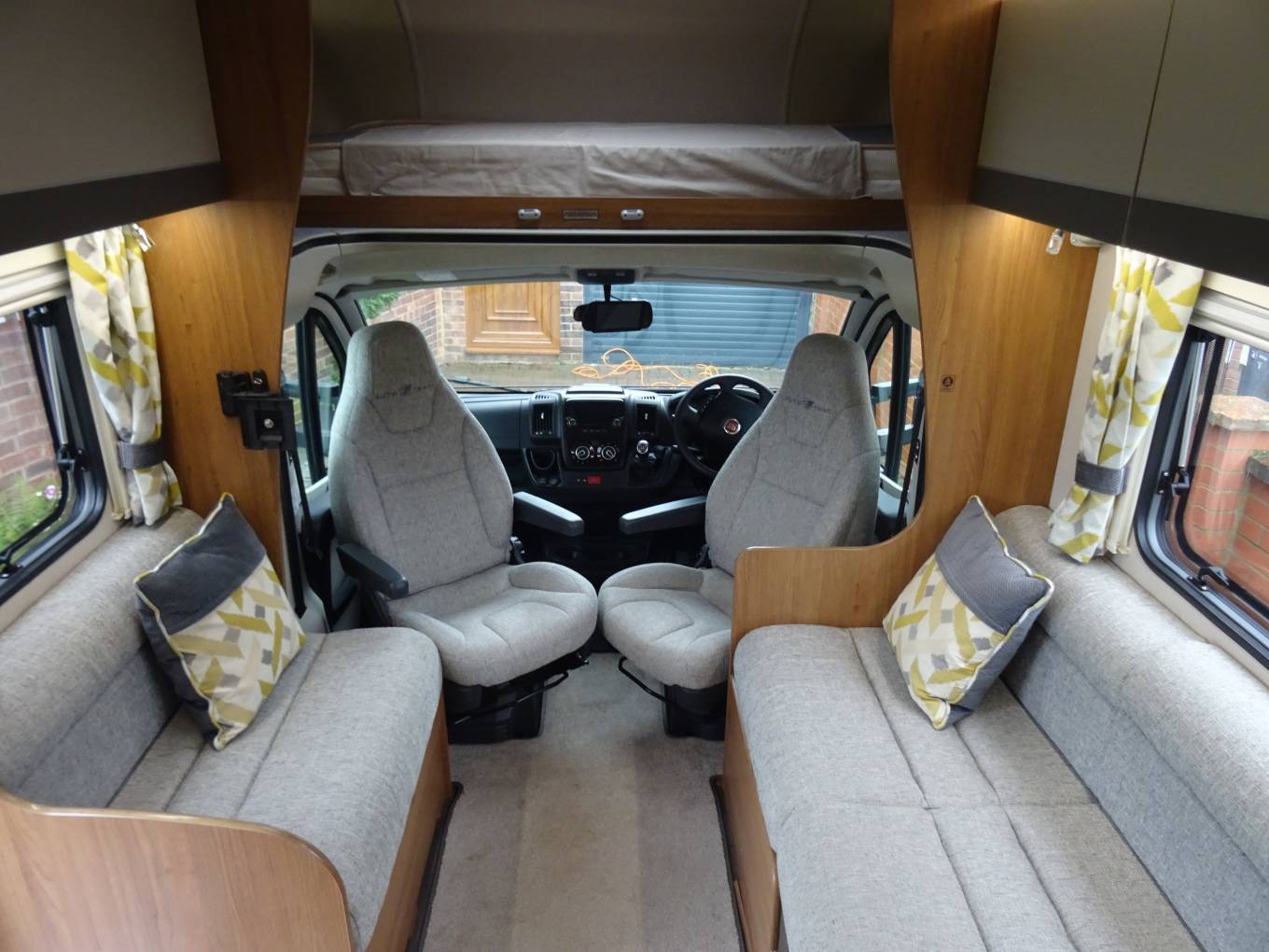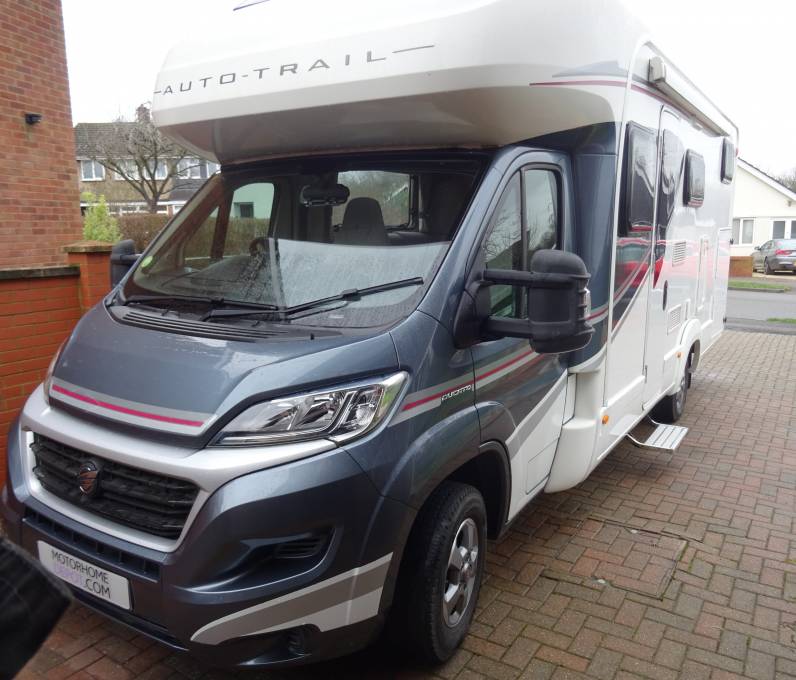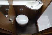 The stand out feature is the huge dual access garage below the rear transverse bed. Both cab seats swivel to complete the very comfortable front Pullham lounge area. There is an over cab double bed and the lounge also converts for our 3rd double. The kitchen area is fully equipped to the usual Auto Trail standard. The washroom benefits from having a separate shower with a sold bi-fold door.