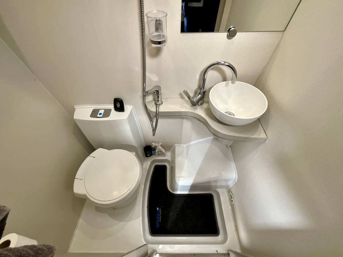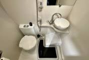 The washroom comes equipped with Thetford toilet with cassette, washbasin, vanity unit and shower.