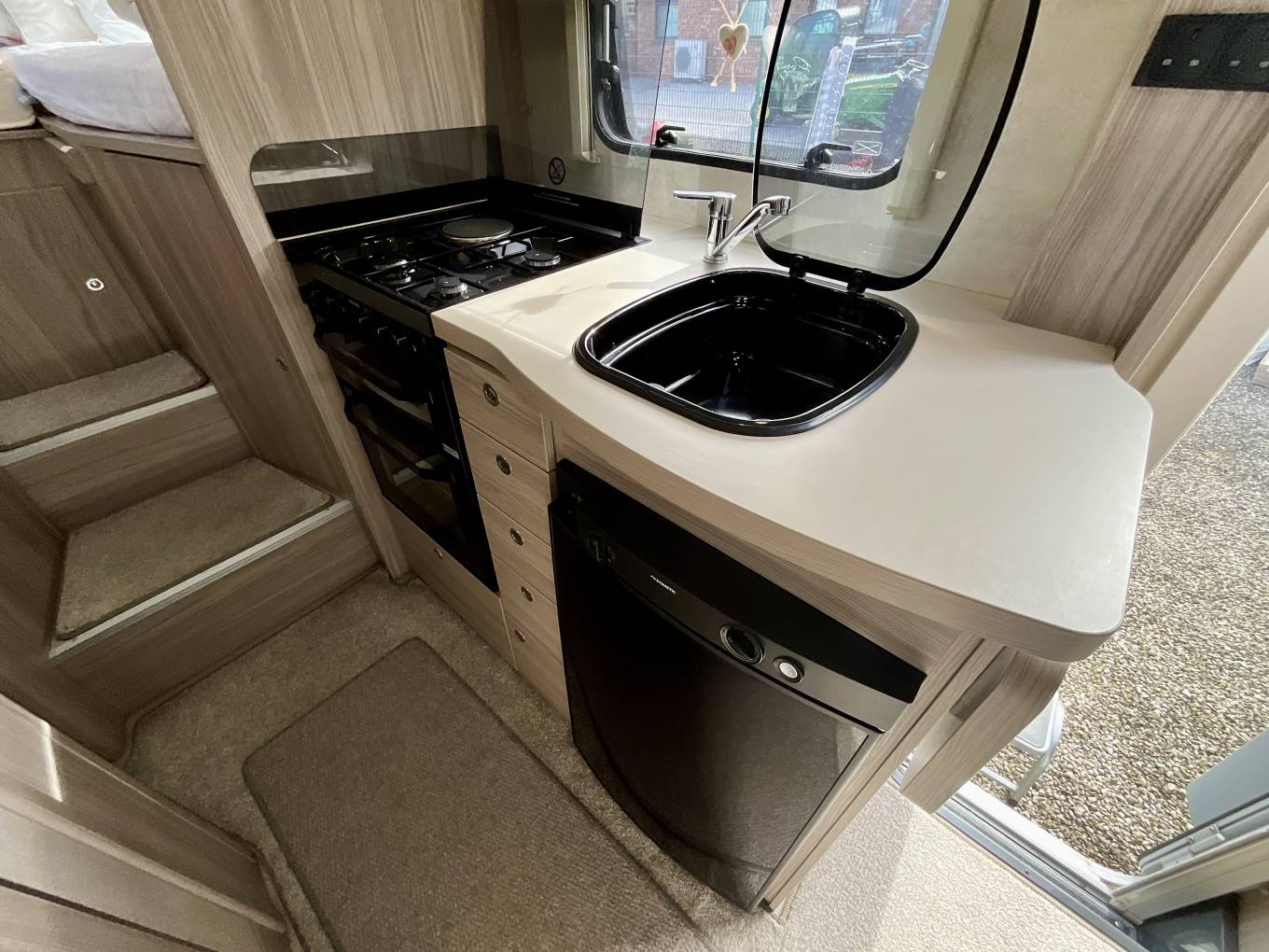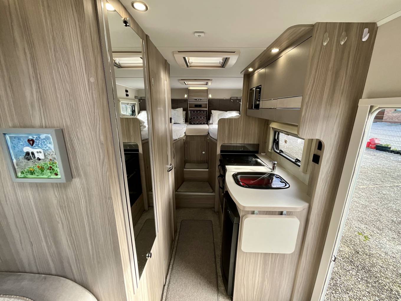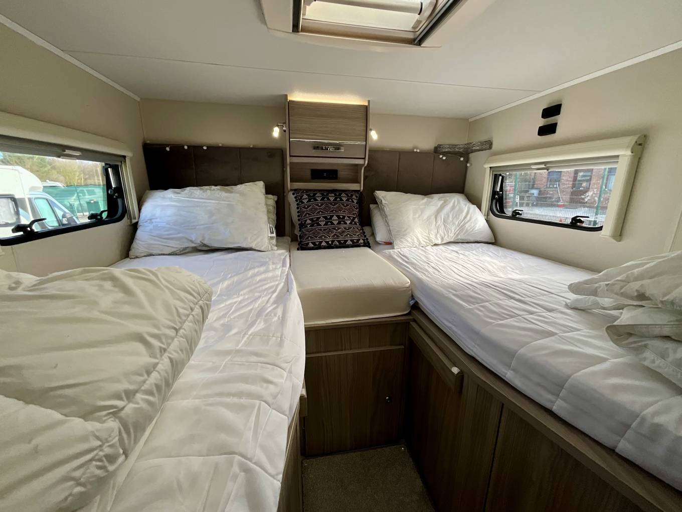 To the rear, the fixed bed can be used as singles or made up as a large double, and sits above a spacious garage, perfect for storing anything you might need on your travels.