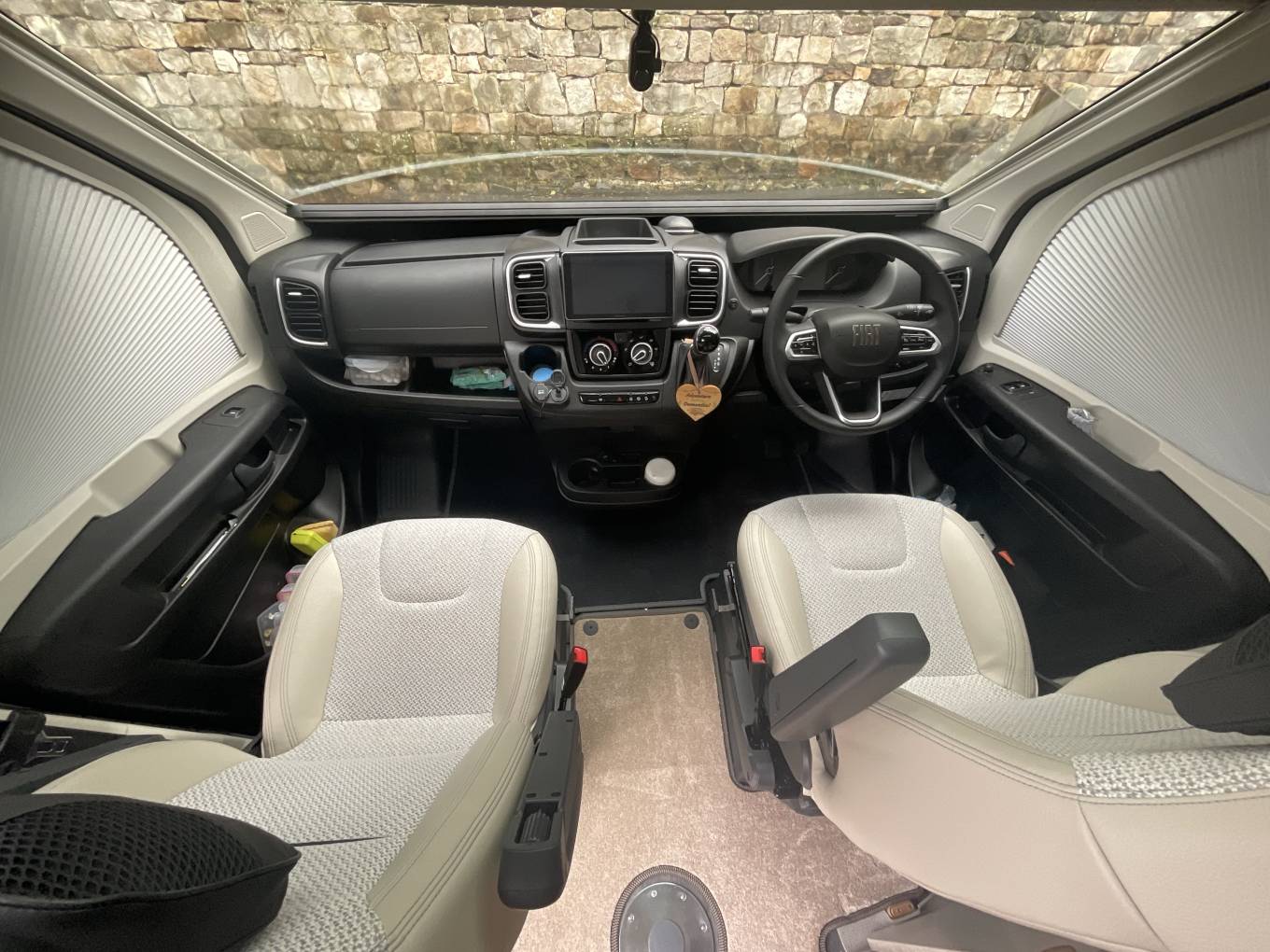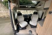 We enter the campervan on the passenger side via an electric step, the front two seats rotate to the rear so you can sit & enjoy a coffee using a round occasional table that stows in the wardrobe.