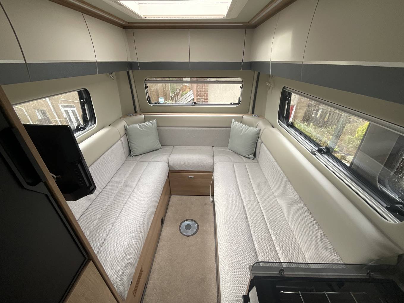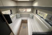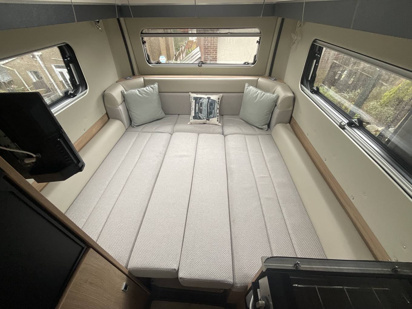 Finally is the triple aspect U shaped rear lounge which is flooded in light. There is a larger table that stows forward when not in use. At night the area can be used as single beds or the sofas pull together to make a large double bed. There is a TV point with flatscreen TV at the foot of the offside sofa.