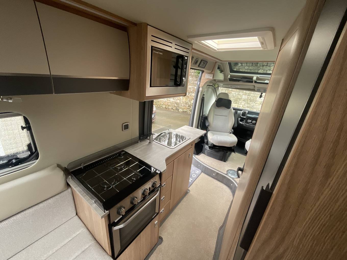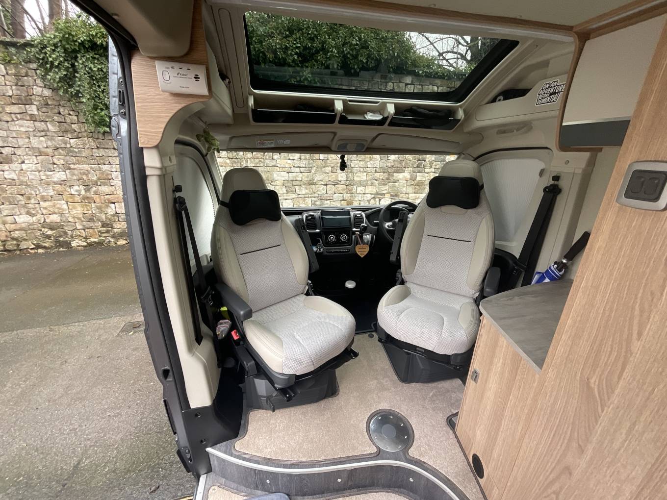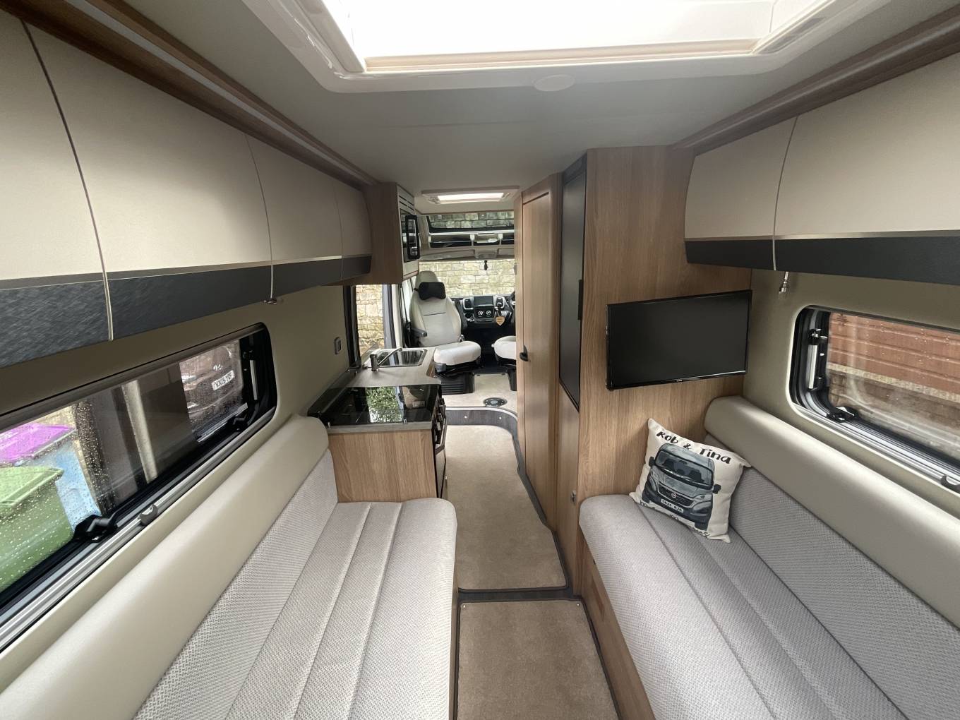 This stylish van conversion from Auto-Trail is light & airy with modern LED strip lighting well placed throughout the campervan. This sort after rear lounge model gives plenty of space for relaxing and can be used a singles or a large double bed at night. Based on the ever popular Fiat Ducato chassis with the 2.2 litre multijet 3 turbo diesel engine with add blue. This with the latest 9 speed ZF automatic gear box, rated as Euro 6 and is Ulez compliant. The cab benefits from: power steering; cruise control; air conditioning; electric windows front; central locking; multi function steering wheel; electric heated adjustable mirrors; Zenex 7” multi media head unit with, apple car paly, navigation, Dab/FM radio; Bluetooth phone & streaming; pull up privacy blind to front screen; remis blinds to side screens.