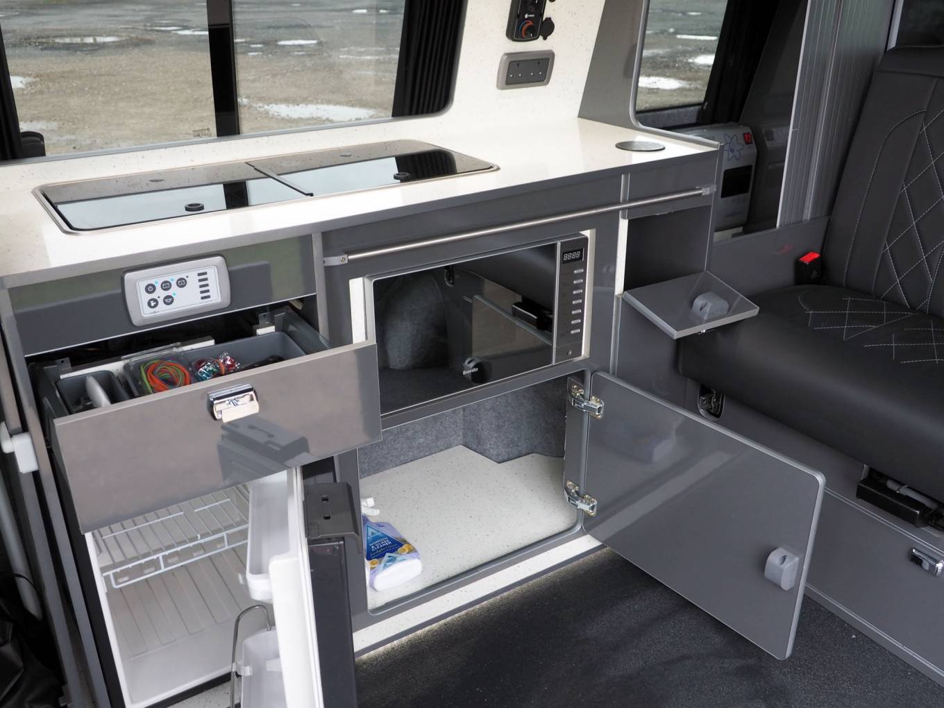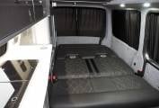 Internally, furniture is nicely finished in gloss grey, with a variety of well planned storage, a hook on table, plus curtains to all habitation windows. The rear bed is quick to pull out and put away, thanks to gas strut assistance in the seat mechanism. Kitchen equipment includes two burner hob, generous sink with cold water supply via onboard tank and pump, 12v fridge and 230v microwave, all in very clean condition. A leisure battery powers onboard systems, charged from a 230v Sargent control panel or from the engine when travelling. The Propex gas heater is mounted under the rear seat and fed from the rear gas bottle.