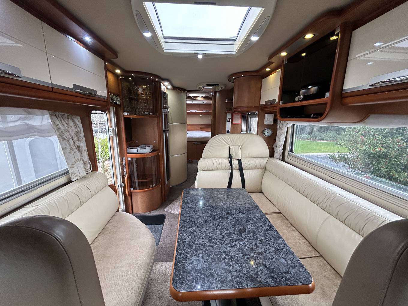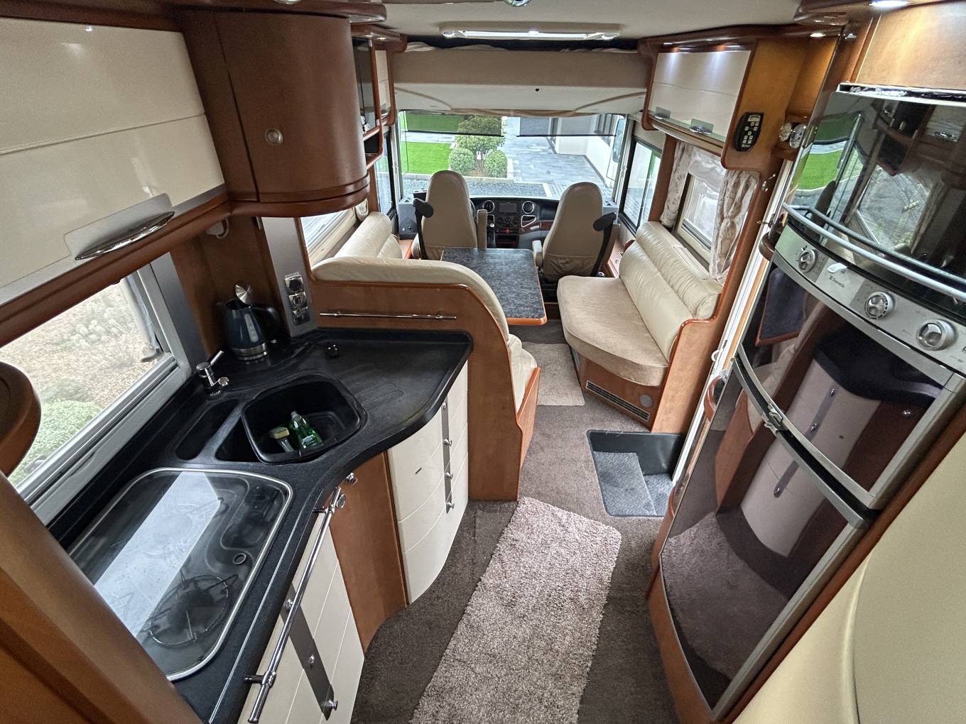 This motorhome is built for true freedom. The solar panel feeding three lithium leisure batteries, combined with a powerful inverter, allows you to stay off-grid with confidence. Park beside a lake, high in the mountains, or on a quiet beach — you’ll still enjoy all the comforts of home. The self-seeking satellite system and twin TVs ensure entertainment is always available, while the Pioneer media system with DAB and Bluetooth provides the perfect soundtrack to your travels.