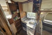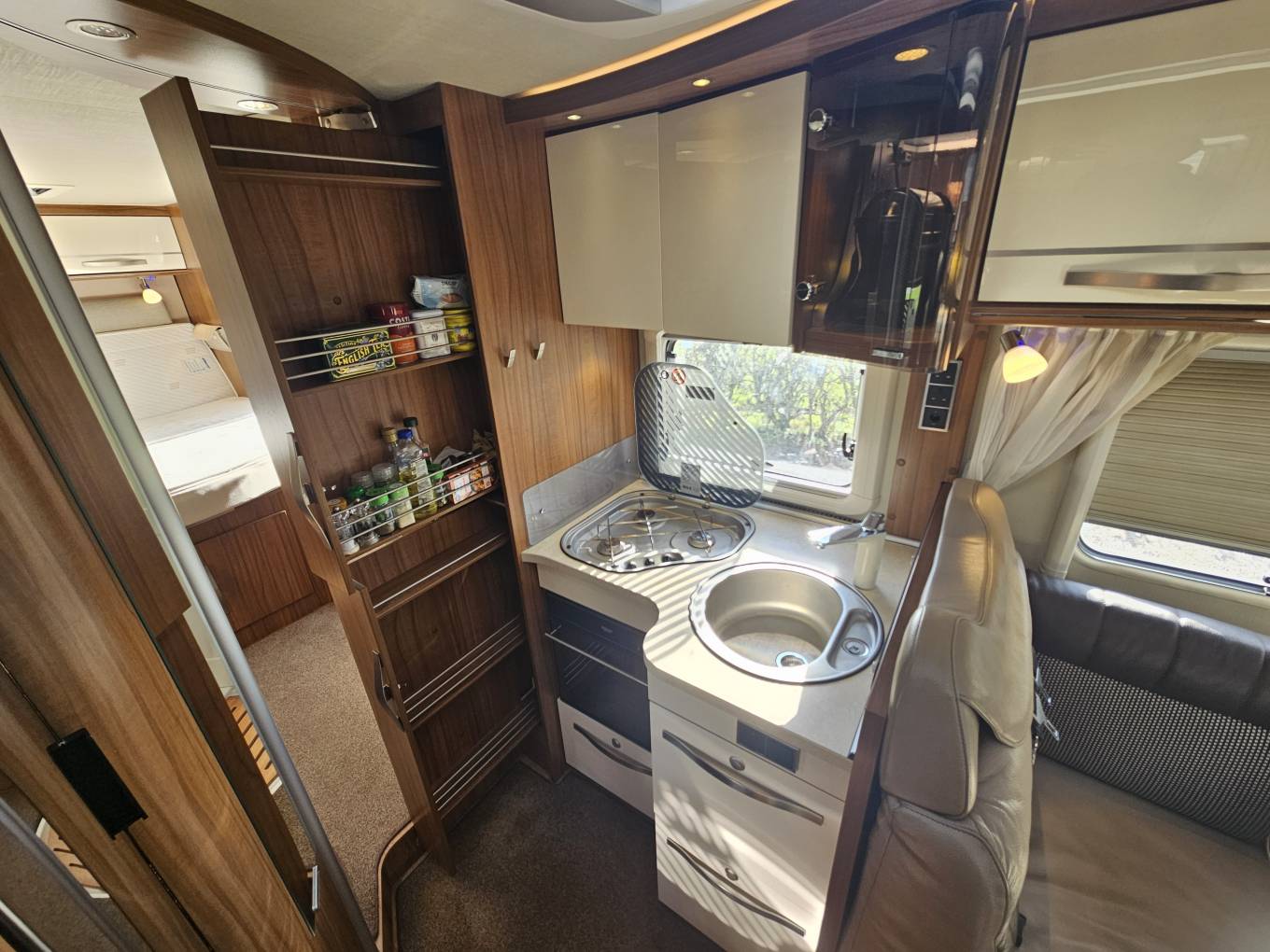 The kitchen is well specified with oven, large fridge with freezer compartment and ample storage, designed for extended touring.