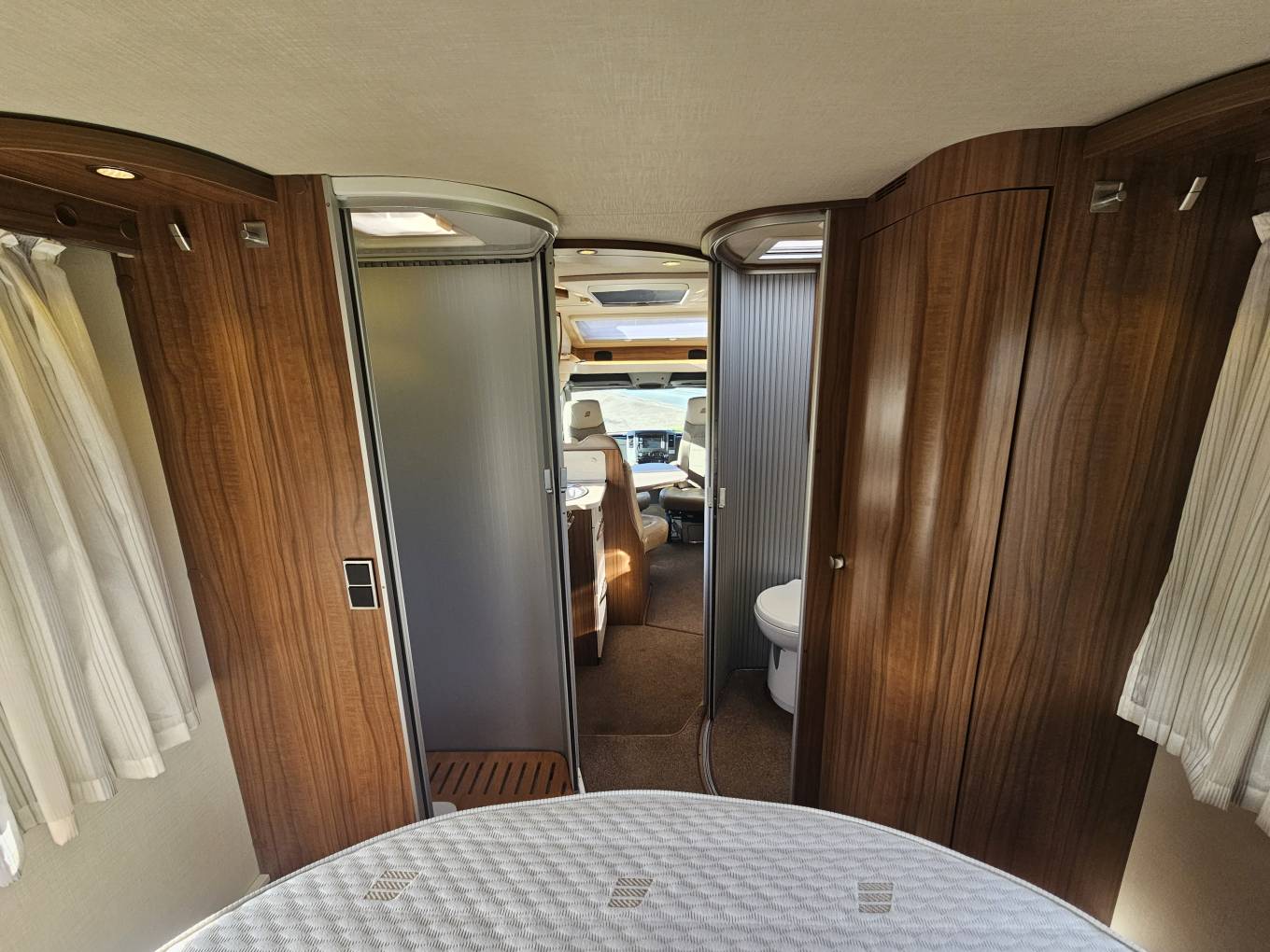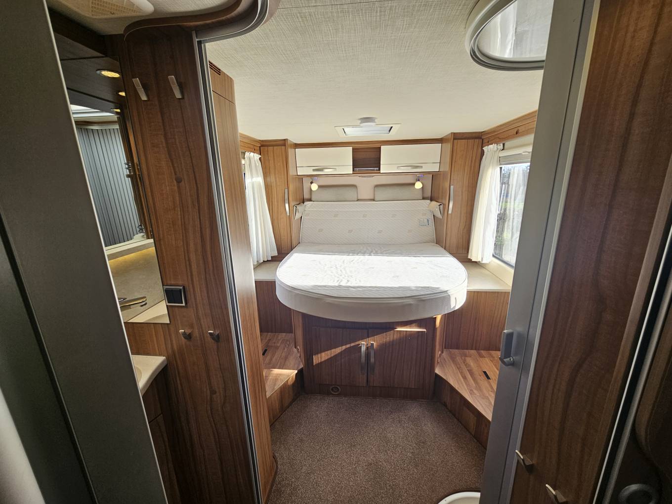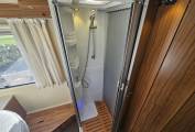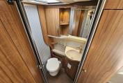 Inside, the layout is practical and comfortable. To the rear is a fixed island bed positioned above a large garage, with surrounding wardrobes and storage underneath. The central washroom provides a separate shower and toilet area, giving proper division of space and a shut off area giving a private feel. Up front, the L shaped lounge and centre dinette create a sociable seating area and versatile 1 berth sleeping arrangement, complemented by double heated swivel cab seats.