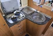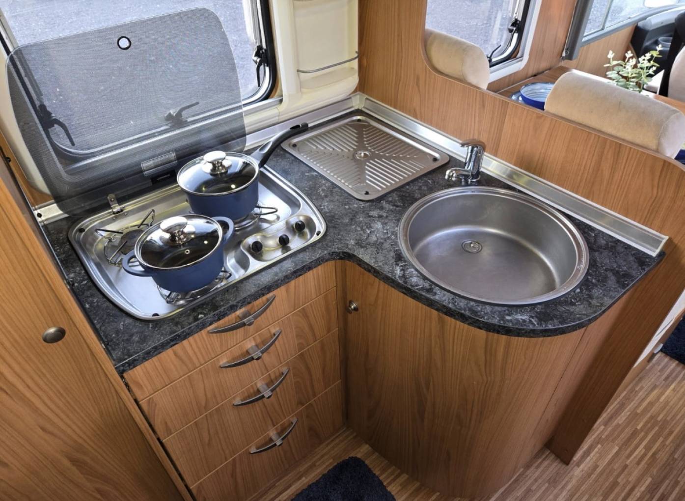 The mid kitchen has a round stainless steel sink with chrome mixer tap, a separate drainer with drain plug, a 3 gas burner hob with glass lid, opposite is a SMEV combination gas grill and oven and below that is a full sized fridge with separate freezer that works on 12v, 240v and gas and there is plenty of cupboards and cabinets to store away your holiday provisions.