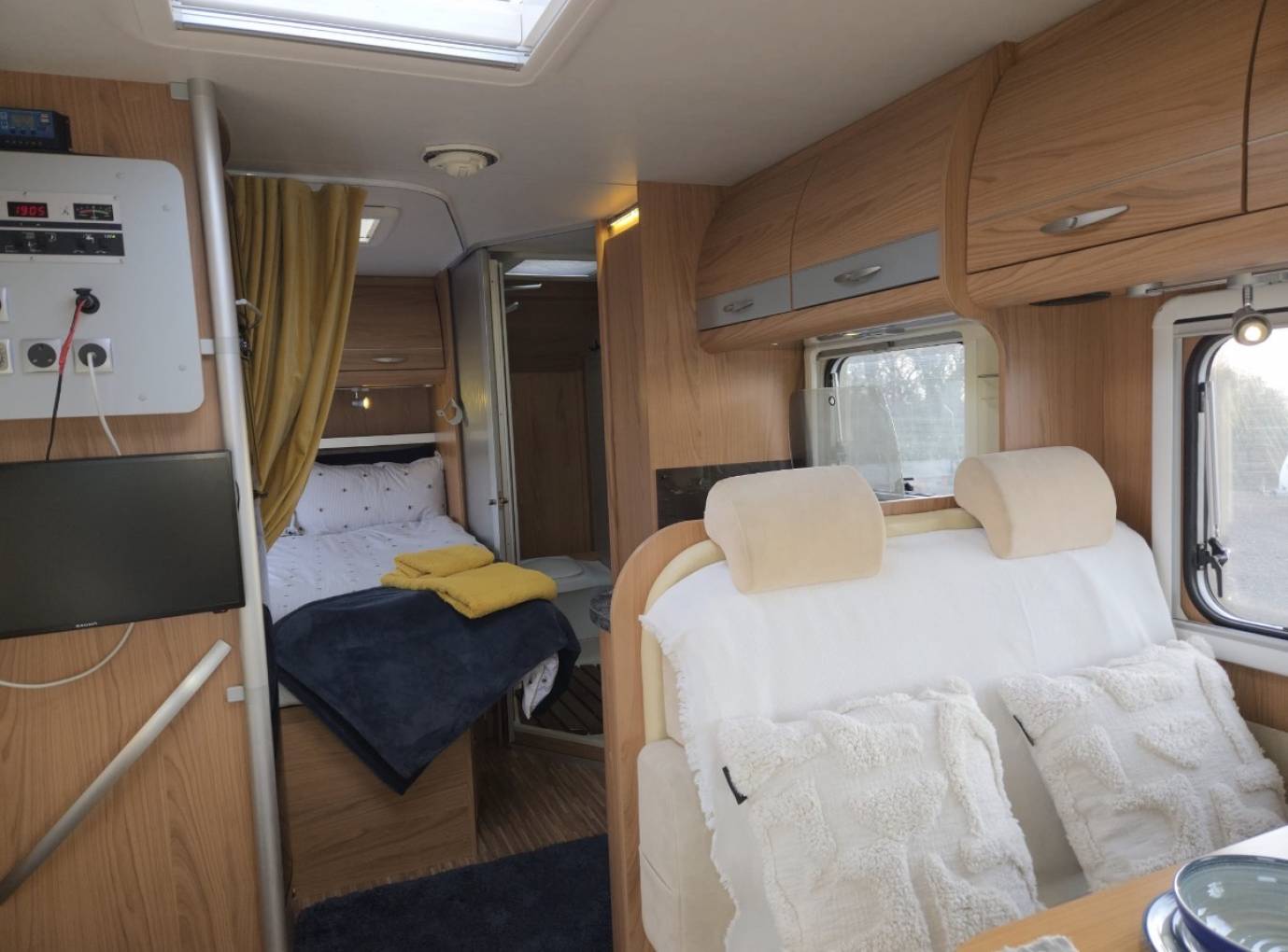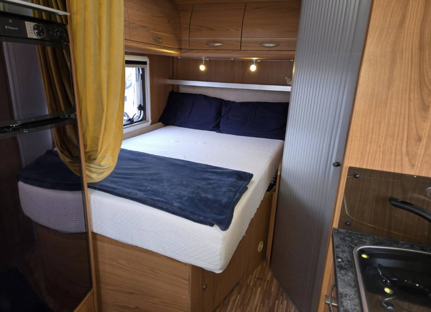 The layout is from entering using the electric step you have the lounge and dining area to your right with a side sofa on the off-side and two forward facing seats that have 3-point seatbelts, a large dining table plus the two front seats swivel to face the habitation area. Two side windows and a large wind-up sunroof flood the area with natural daylight and fresh air and there is a wall TV fitted for this area. Above the cab is a large drop-down double bed with a fresh new bed topper fitted and this area has a roof vent with black-out blind.