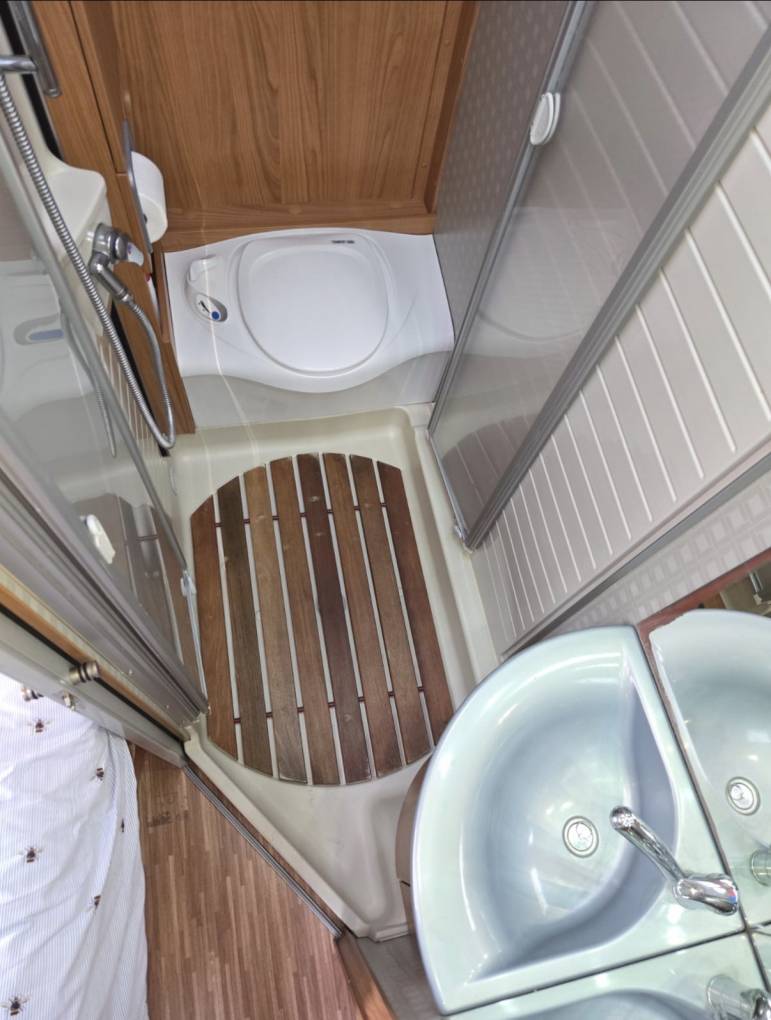 The main feature is the rear bedroom with a double bed that has a new extremely comfy mattress that lifts up to reveal a storage area that's also accessible form an external locker door. Upper aircraft style cabinets for additional storage, a side window and a sunroof to provide natural daylight. There is a TV cabinet and a there's a privacy curtain fitted to section off the bedroom area. The washroom has a good sized separate shower cubicle with folding Perspex doors, a built-in washbasin with chrome mixer tap, mirror above and cupboard below, a Thetford cassette toilet with electric flush, plus a clever side sliding storage cabinet. Outside is a large wardrobe with hanging rail which also houses the raiseable TV aerial.