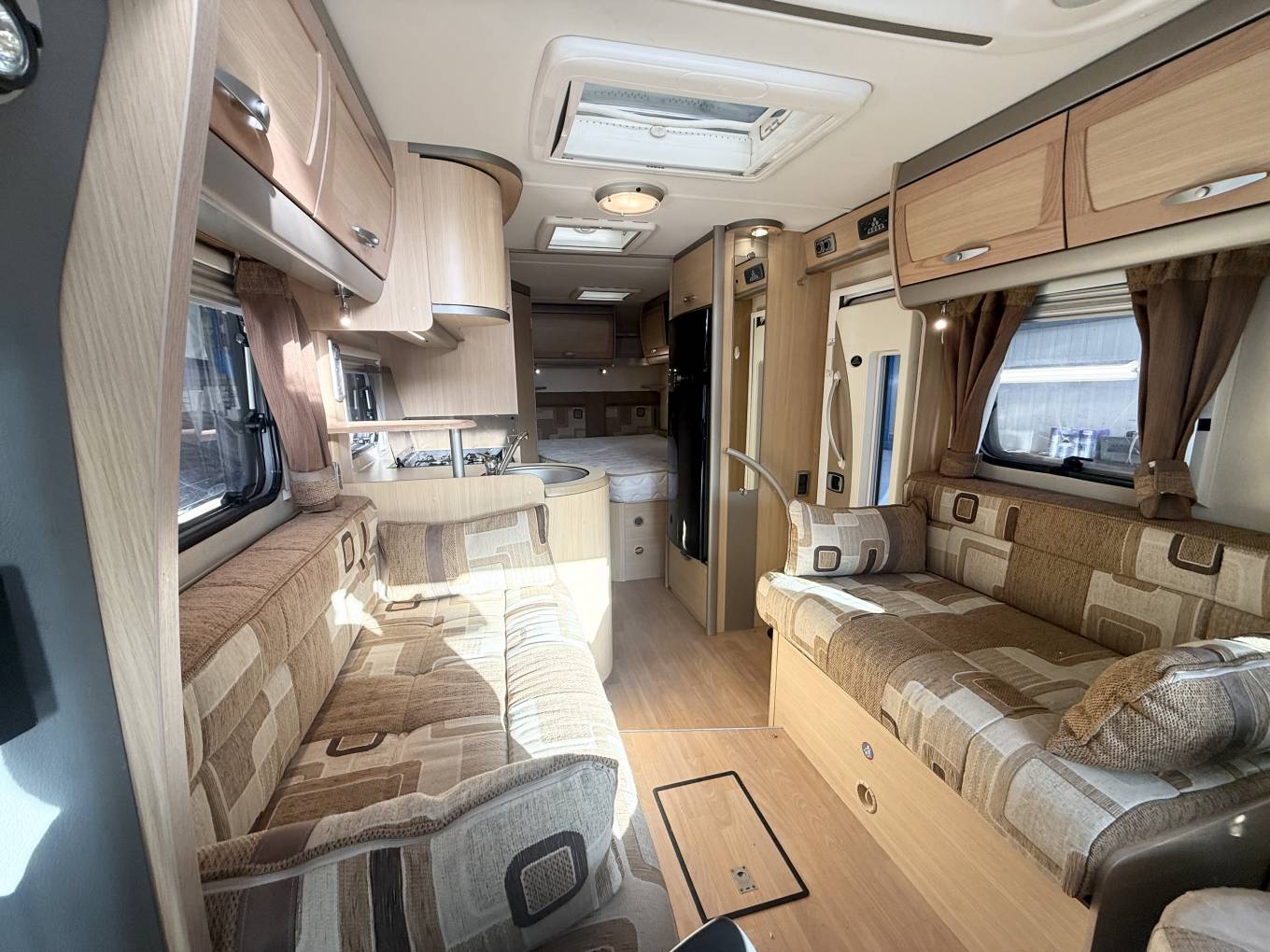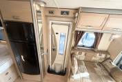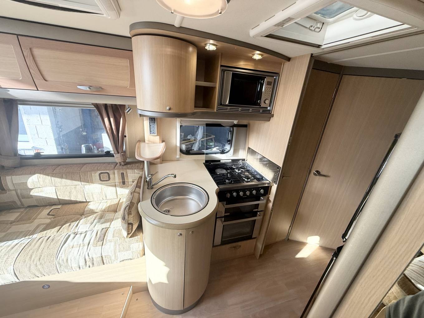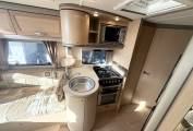 Enter through the habitation door and you have the kitchen in front of you, with a large stainless steel circular sink and chrome mixer tap, a three gas burner hob along with an electric hotplate and gas grill and oven below, above is the microwave and opposite there is a large 3-way powered Dometic fridge with separate freezer unit above and a variety of good-sized storage cabinets throughout.