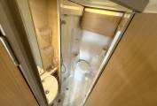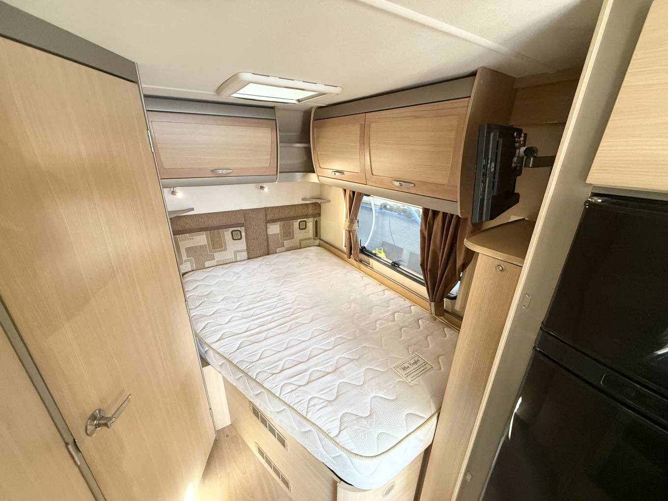 The generous corner washroom has a walk in shower cubicle with a frosted shower screen divider, the washbasin with a chrome mixer tap, a Thetford cassette swiveling toilet and a medicine cabinet and mirror. Next to here is a generous sized French double fixed bed in the corner with side window and reading lights and great storage underneath.