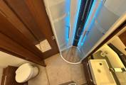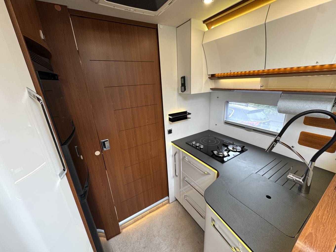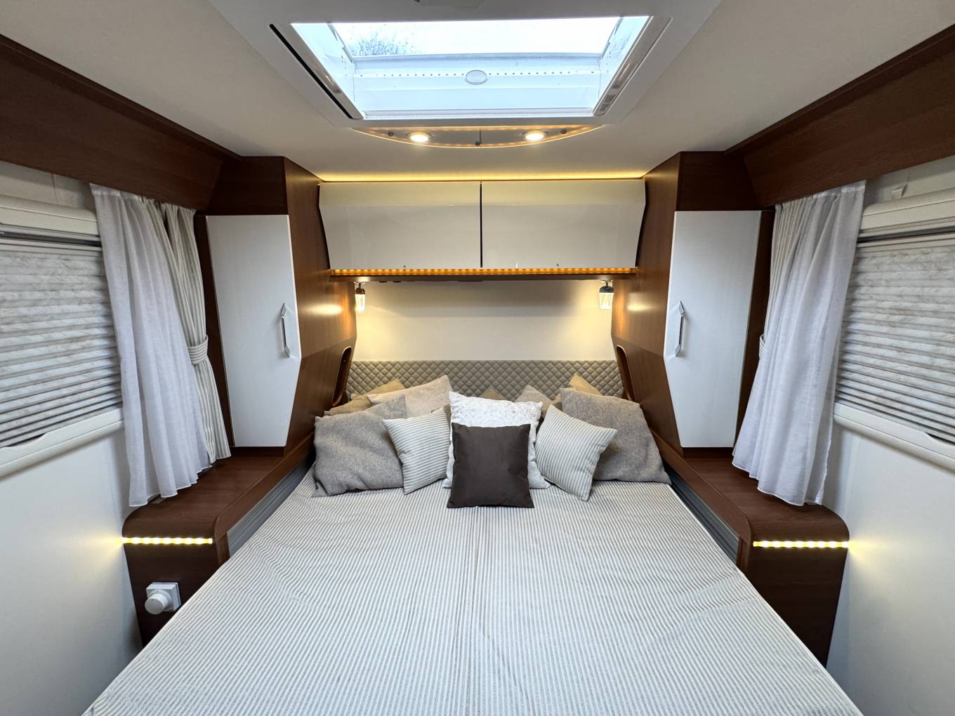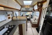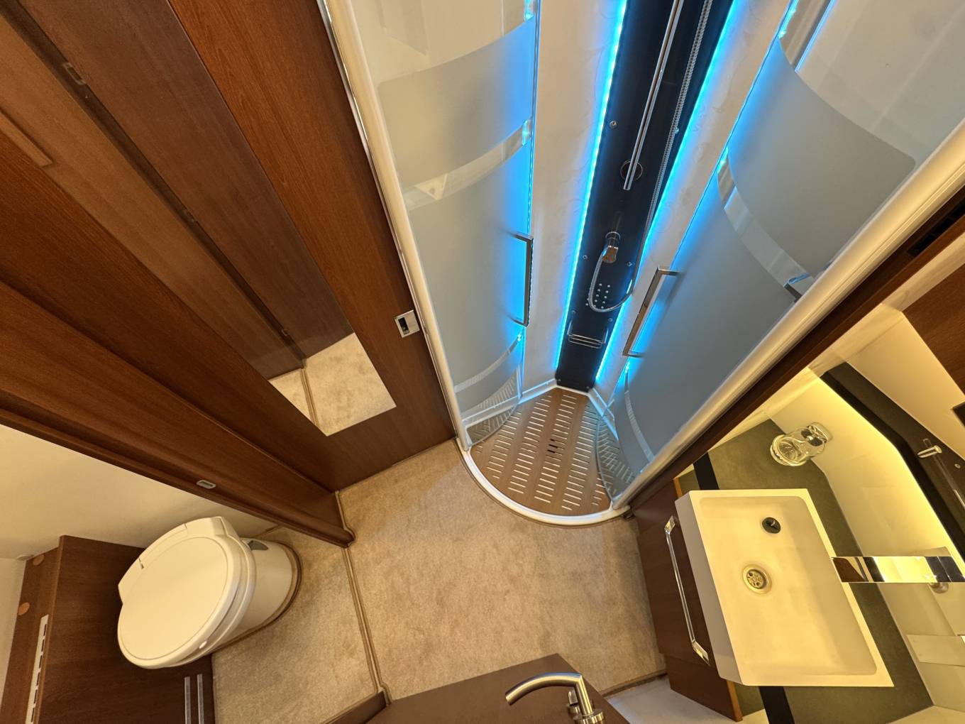 The automatic gearbox provides smooth and straightforward driving. Inside, the upgraded leather upholstery gives a high-quality finish throughout. The motorhome benefits from air conditioning throughout, an underfloor wet heating system, and additional blown air heating, making it suitable for use in all seasons.