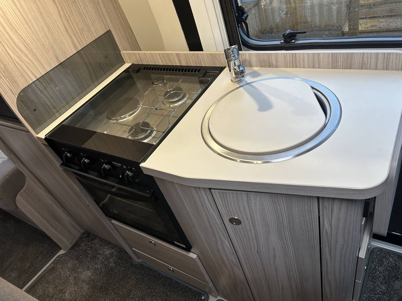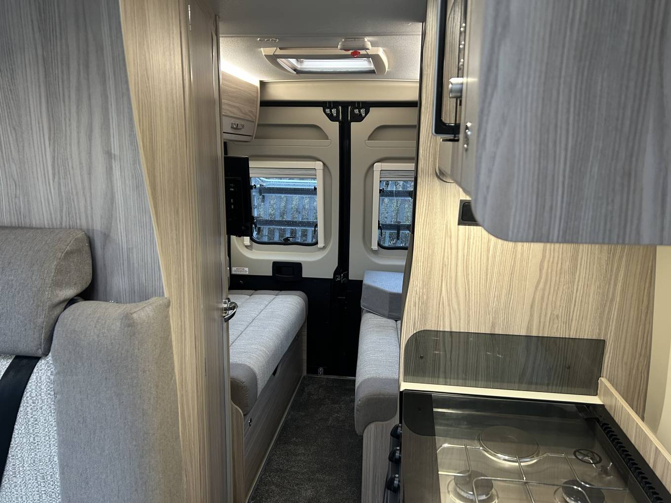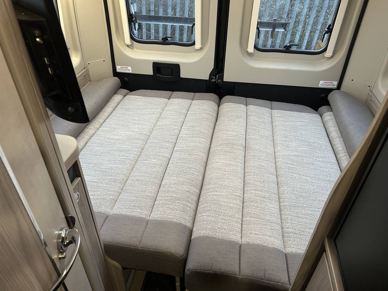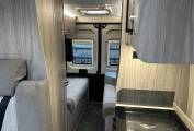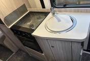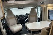 The interior layout is both clever and versatile, offering a true 3-berth, 4-belt configuration. At the rear, the bright and airy lounge converts into a generous transverse double bed, providing a comfortable main sleeping space, while the centre dinette transforms into a small single bed for a child or guest. Swivel cab seats open the living area, and the fold-out dining table ensures there’s plenty of room to eat, work or relax. Premium touches such as TV, Remi front blinds, flyscreen across the habitation door and removable carpets add to the overall comfort and usability.