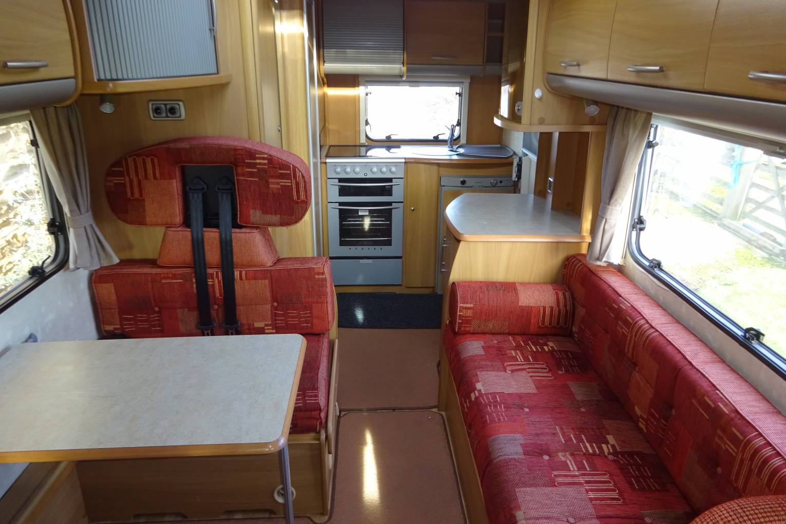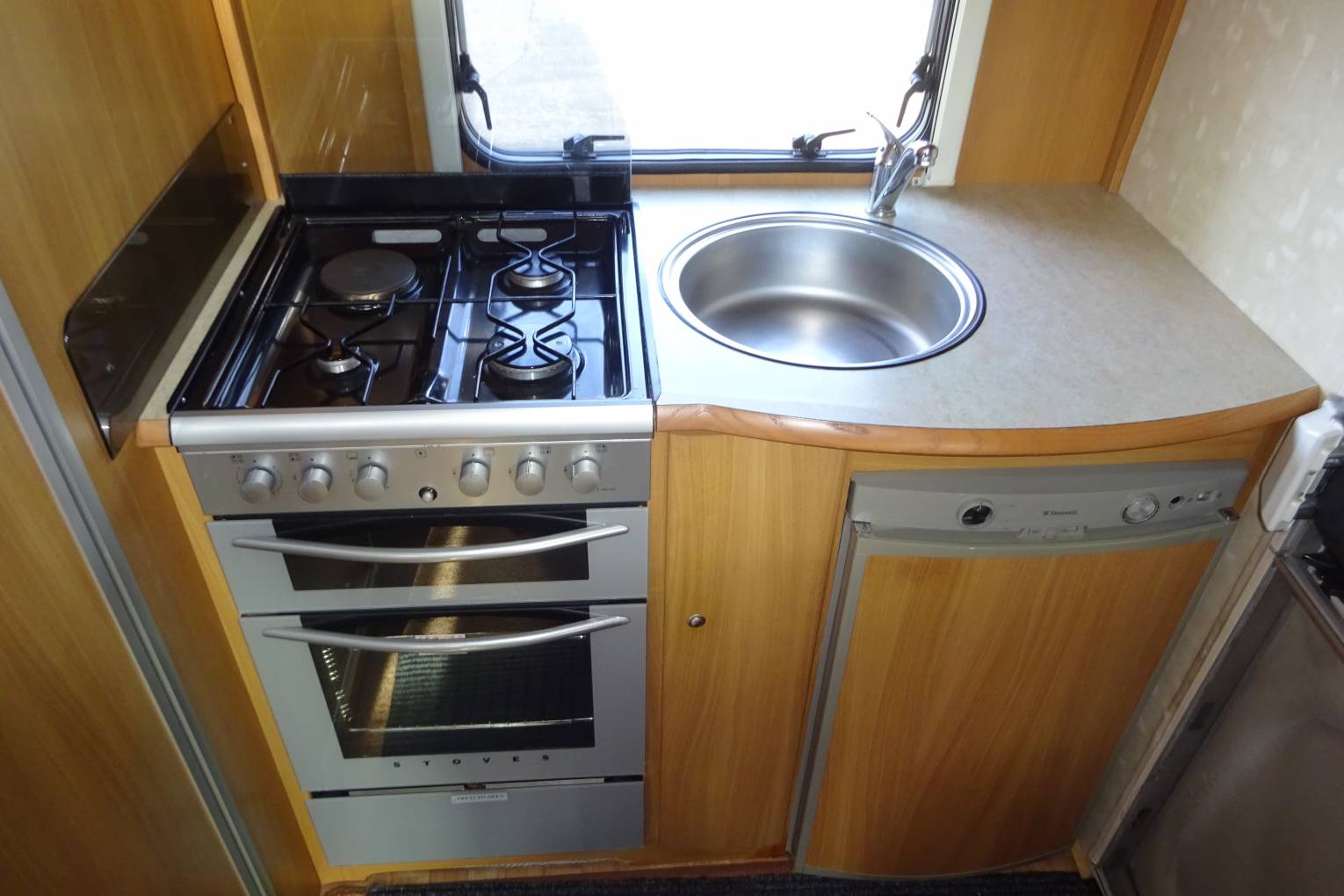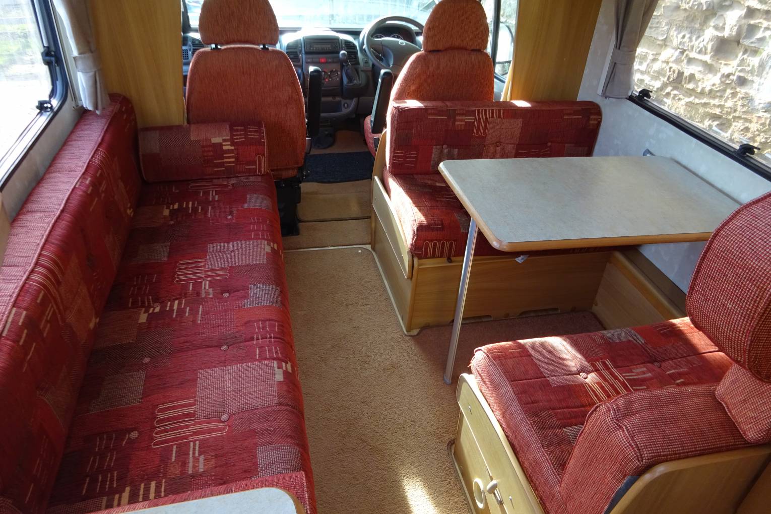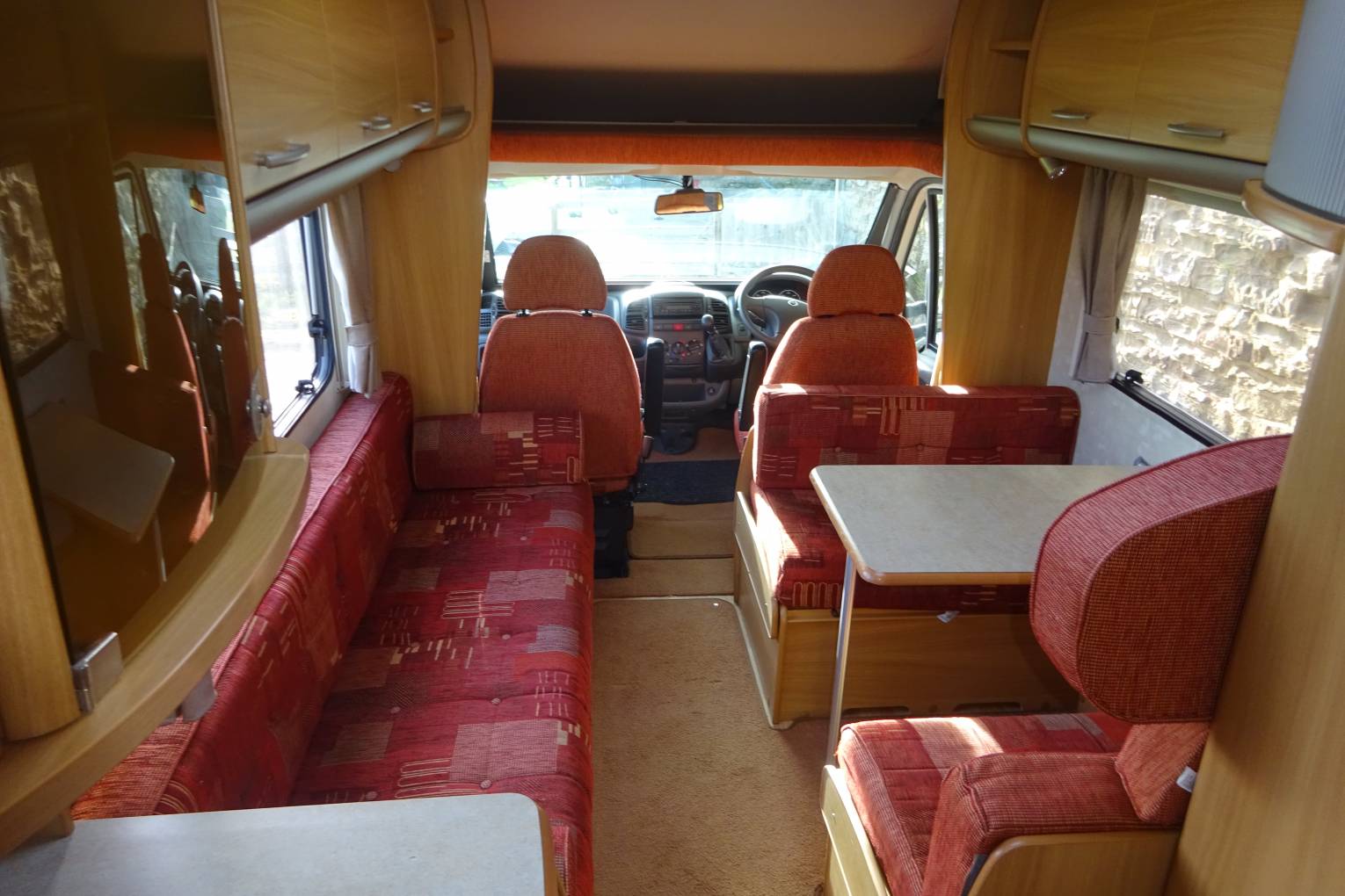 As you step inside the motorhome you can appreciate the spaciousness of the Motorhome with a light, warm, comfortable feel. The end kitchen layout makes good use of the space. The well equipped kitchen with a 3 burner gas hob supplemented by a 4th electric ring, oven and grill, sink, and three way fridge allows for all your cooking needs. With a good sized bathroom offering what you would expect from a motorhome of this standard. The living area is completed with seating for 7 around the table. The settees easily makes up in to a large double bed. There is a 2nd large double above the cab and a 5th bunk on the long settee. There is ample storage throughout the motorhome for all your needs. The furnishings and cupboards are all in good condition.