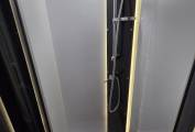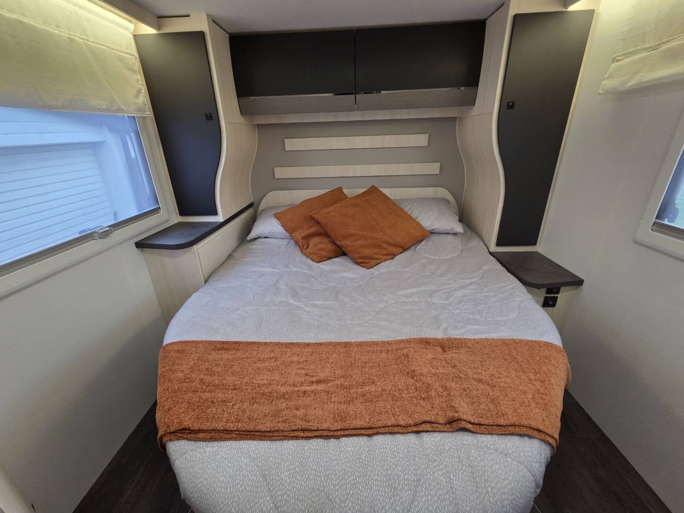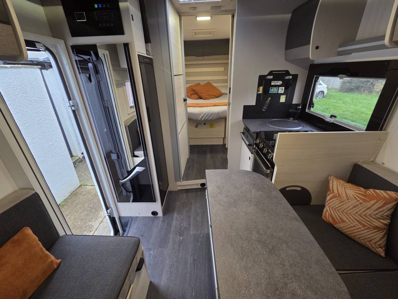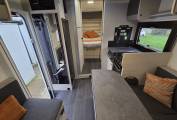 To the rear is the sumptuous double bed(1.9m x 1.6m) with individual wardrobes and storage space underneath. The bed is raised and lowered with a light cranking handle so you can adjust the height thus giving you more room in the excellent rear garage which can be accessed from the external door on the driver side but also a top-hinged hatch in the rear wall.