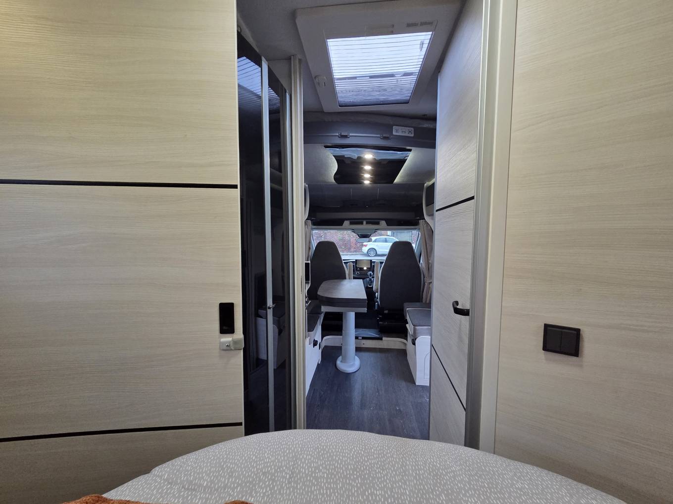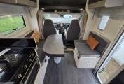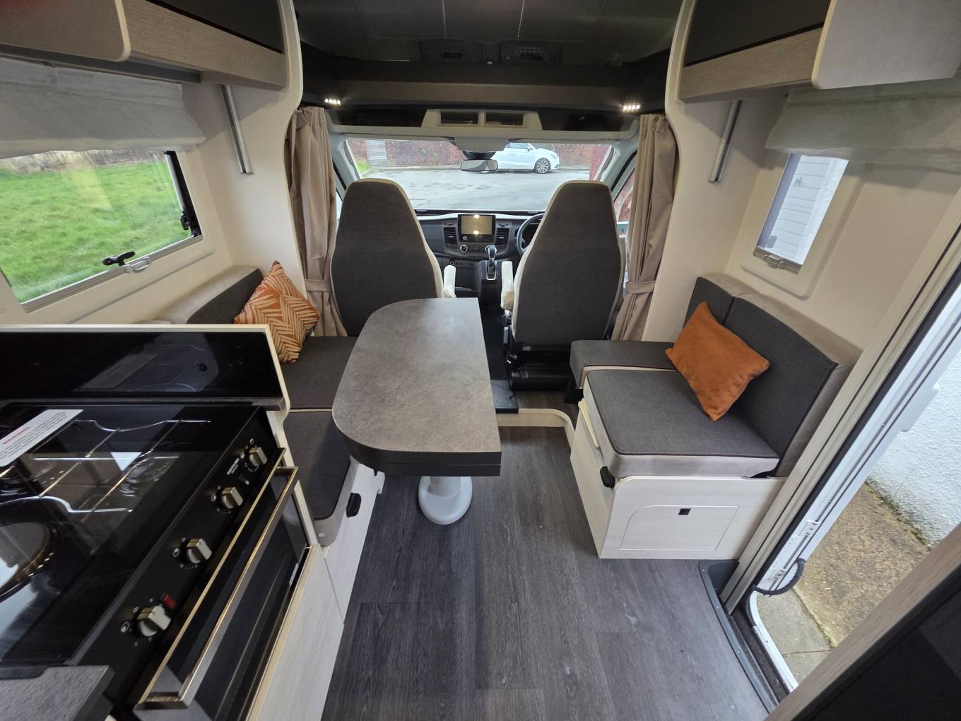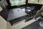Entering the van via the habitation door in the driver side, there is the forward dinette and social area which offers twin opening sunroofs, two side settees and swivel cab seats. Under each settee is a pop up travelling seat with 3 point seatbelt, while the multi-position folding pedestal table is extremely convenient for dining. Its a light and airy living space with good storage too. The cab can be quickly screened off for privacy and there is a cab curtain.