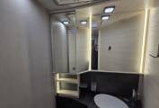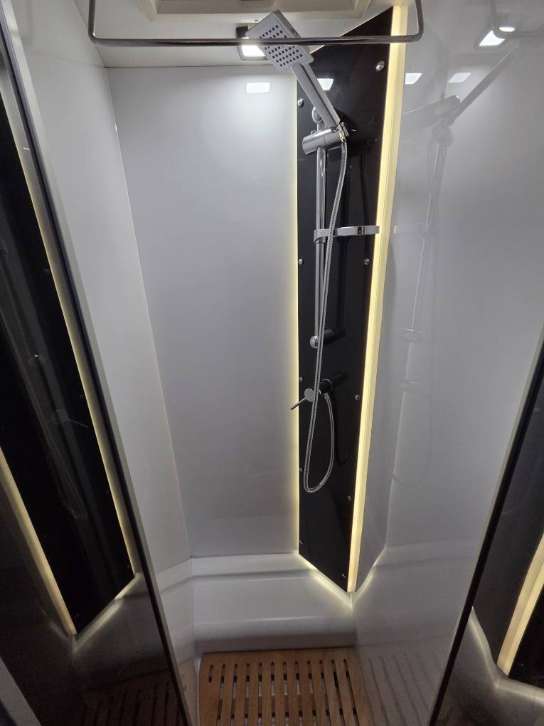 Midships you will find a well equipped kitchen with gas hob, oven and grill, large fridge freezer and a variety of storage. A TV is mounted here for rear or front viewing and the washroom with separate shower cubicle straddles the aisle, giving full privacy with solid partitions and a separate shower cubicle.