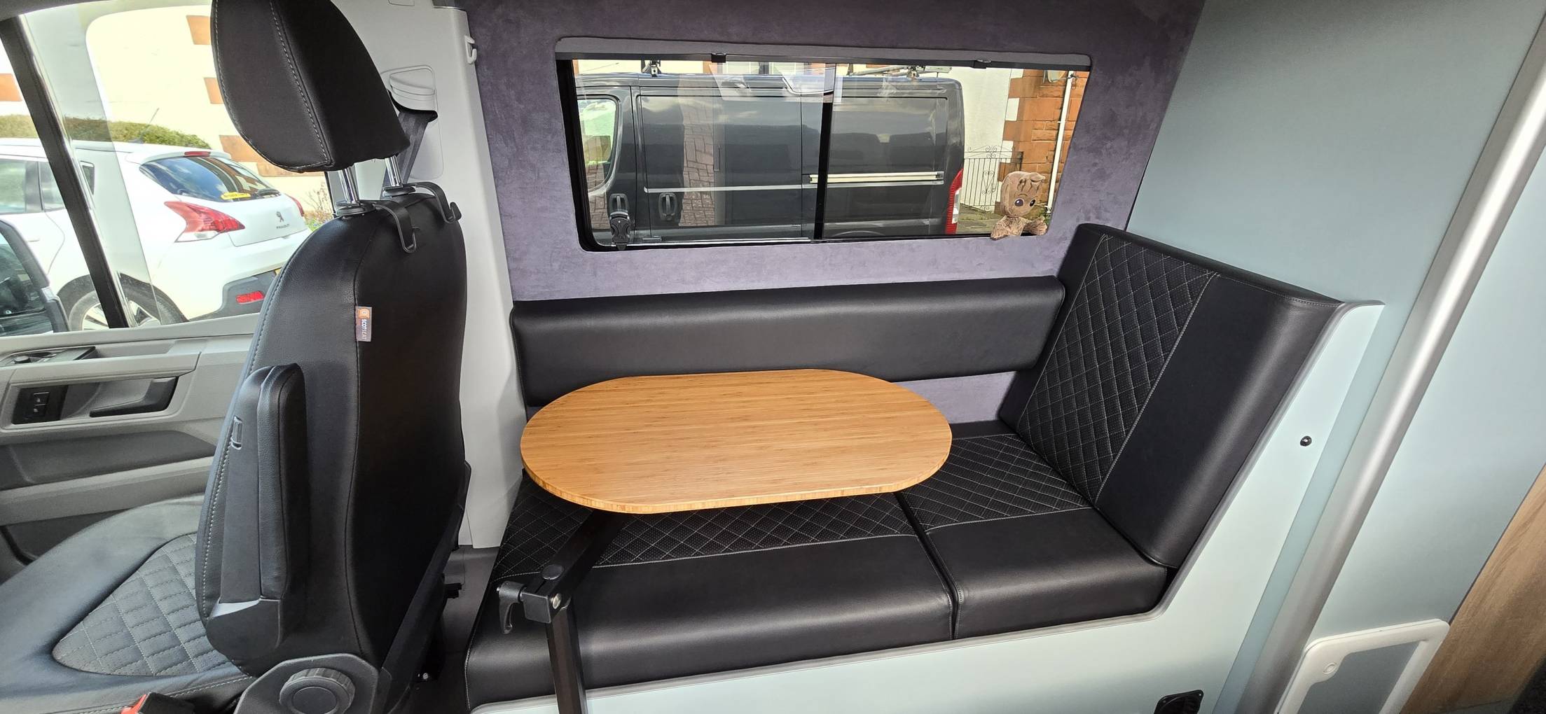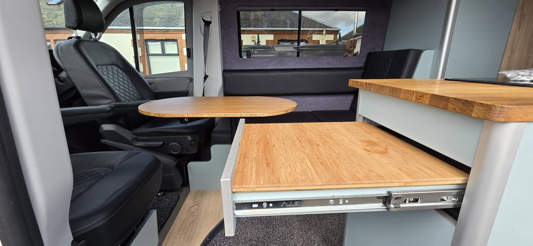 VW factory fitted swivel captain’s chairs recovered with black leather to match the interior colour works done by www.scotseats.co.uk