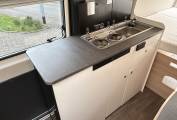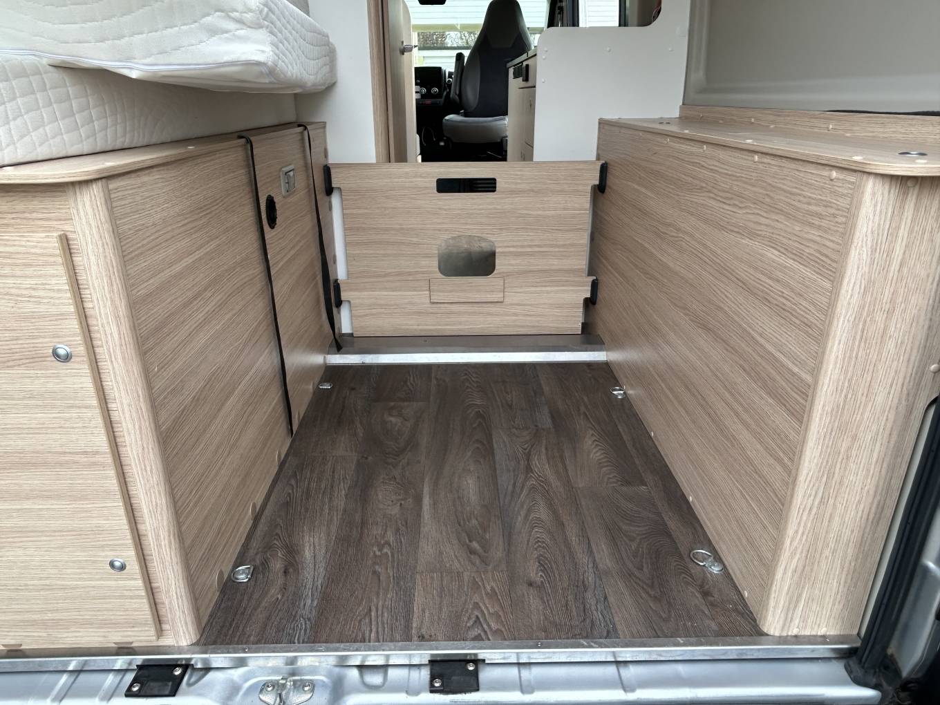One of the standout features of the Cliff 600 is its highly desirable compact length of just 5.99 metres. This makes it exceptionally easy to drive, manoeuvre, and park compared to larger motorhomes, allowing you to confidently explore narrow country lanes, towns, and coastal destinations with ease. Despite its manageable size, the interior is cleverly designed to maximise space and comfort, offering a comfortable rear bed, two swivel cab seats, an extending dining table, and seating with four travelling seat belts. The large rear storage area is perfect for bikes, outdoor equipment, or additional luggage, making it ideal for active adventures.