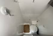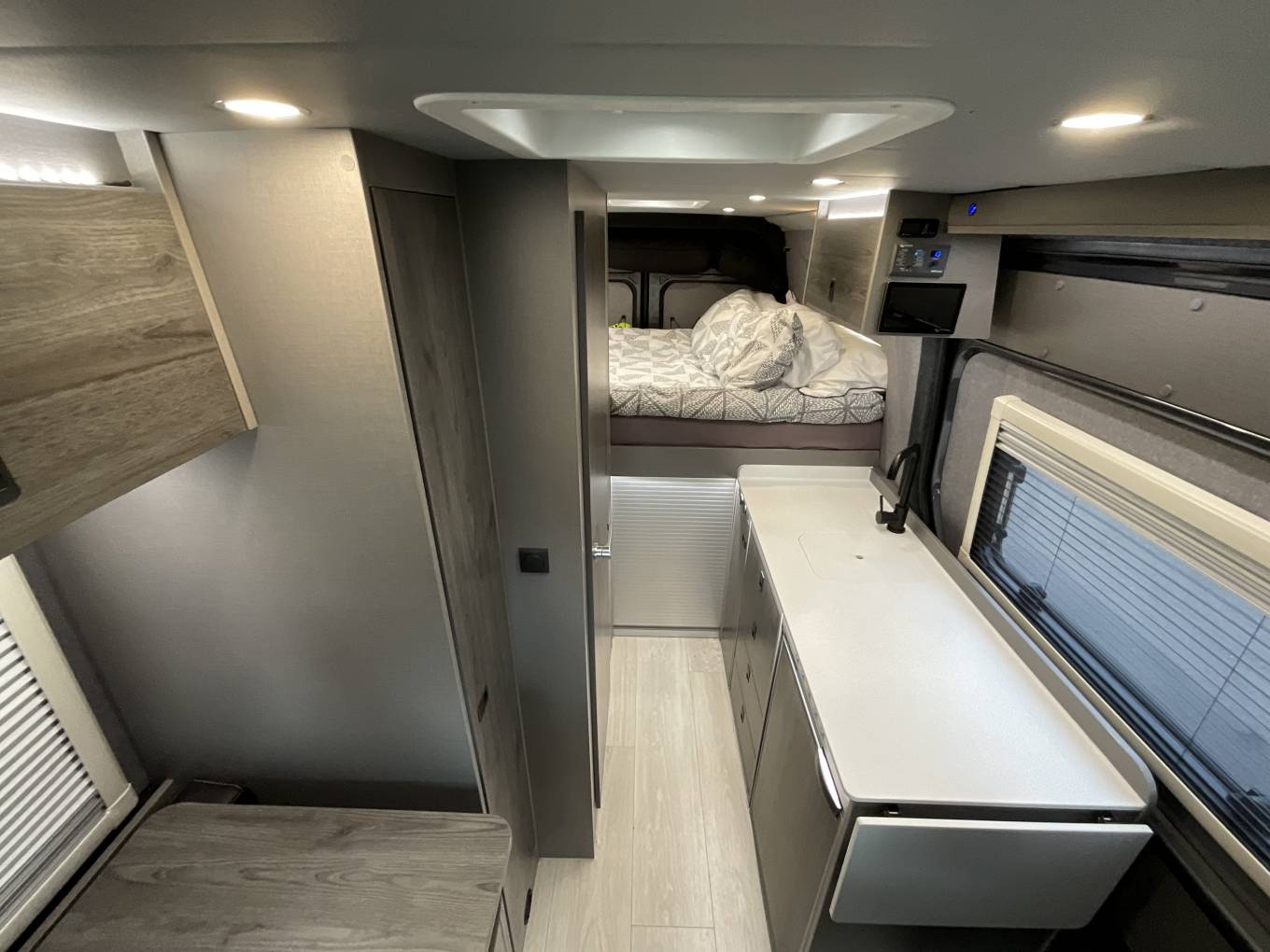 The well-appointed kitchen area includes a handwash basin, 12V fridge, and the capability to run an electric induction hob — ideal for preparing meals on the go. The washroom is fitted with a Thetford electric flush toilet and a shower point, providing added convenience when travelling.