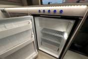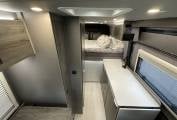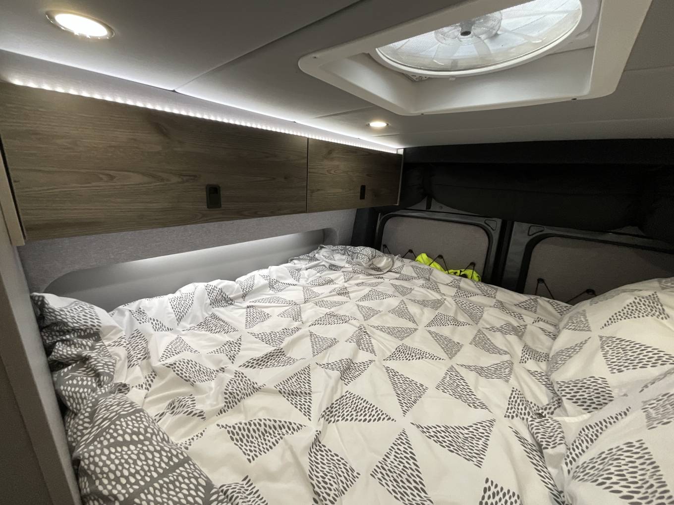 To the rear, you’ll find a comfortable fixed double bed with overhead storage and integrated lighting. Beneath the bed, the spacious garage area offers excellent storage solutions, complete with roll-out storage and additional cupboard space.