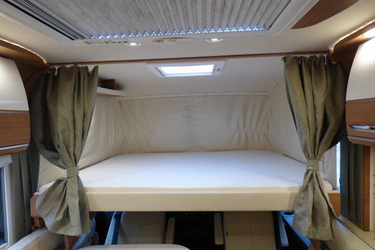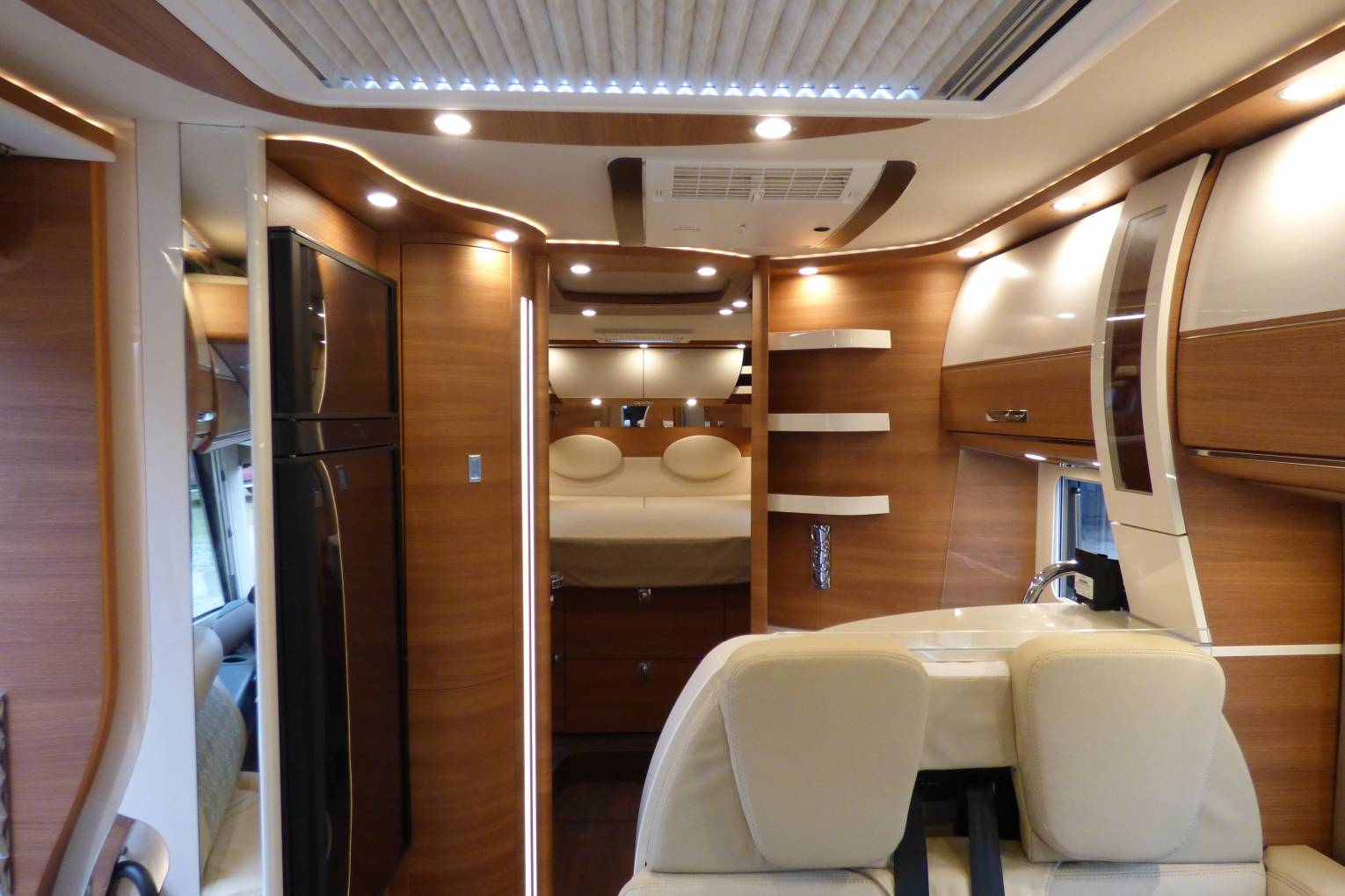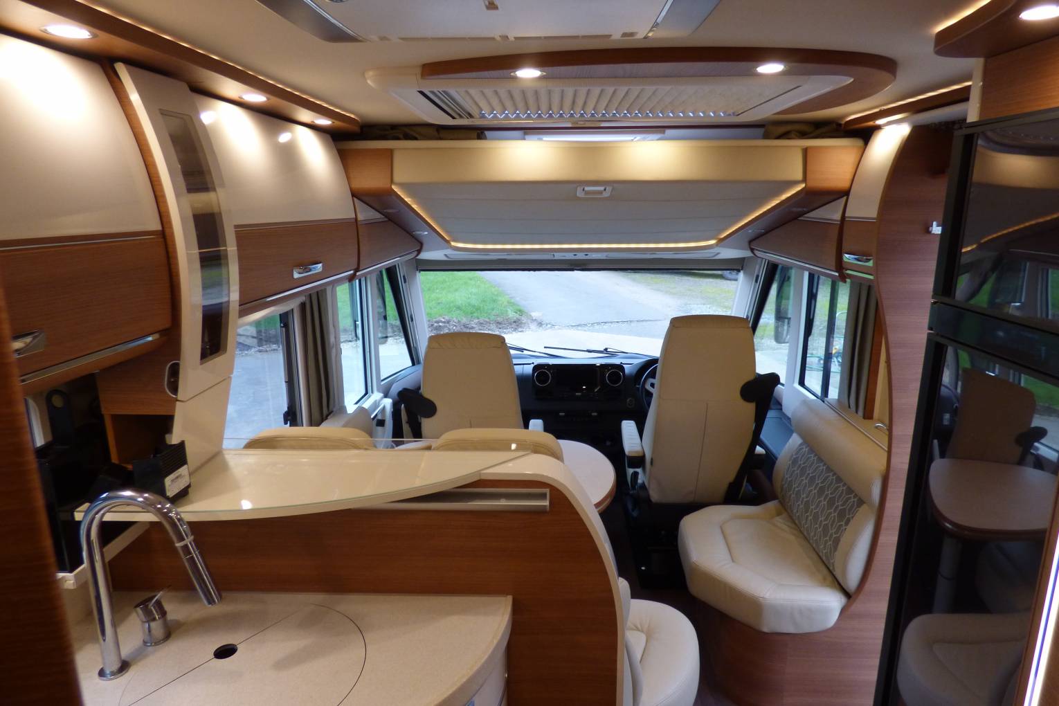 The kitchen is as you would expect fully equipped with 3 ring gas hob, sink and prep area, built in coffee machine and feature glass holder opposite a very large fridge and freezer, There is further storage in the double floor under the lounge area and also head height lockers in abundance. The lounge area benefits from 5g ready wifi and a further TV.