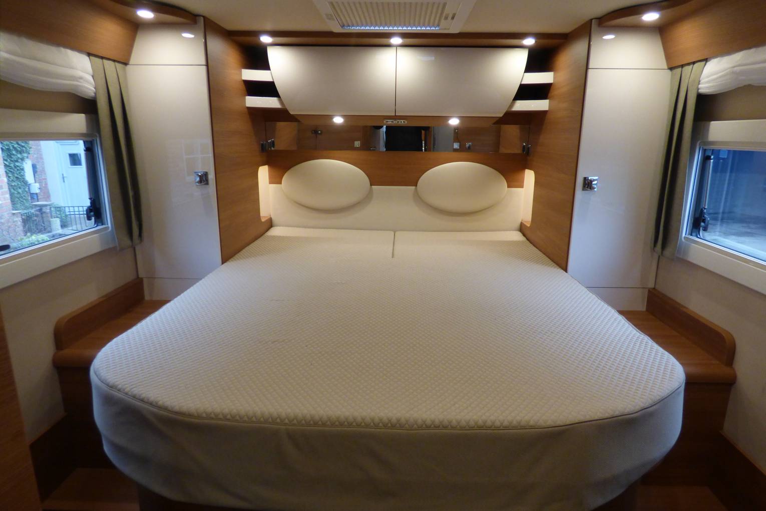 The washroom consists of w.c. (SOG version), large vanity unit and sink with storage and mirrors, opposite a full sized shower cubicle. The bedroom can be isolated from the rest of the habitation by sliding the doors in the bedroom across, alternatively the bathroom door can be separated and closed off from the habitation to create an ensuite area for the master bedroom with the other half of the bathroom door providing privacy. The bedroom has either side large wardrobes, storage lockers under the bed and a full height wardrobe just behind the TV.