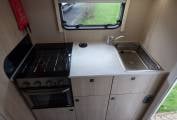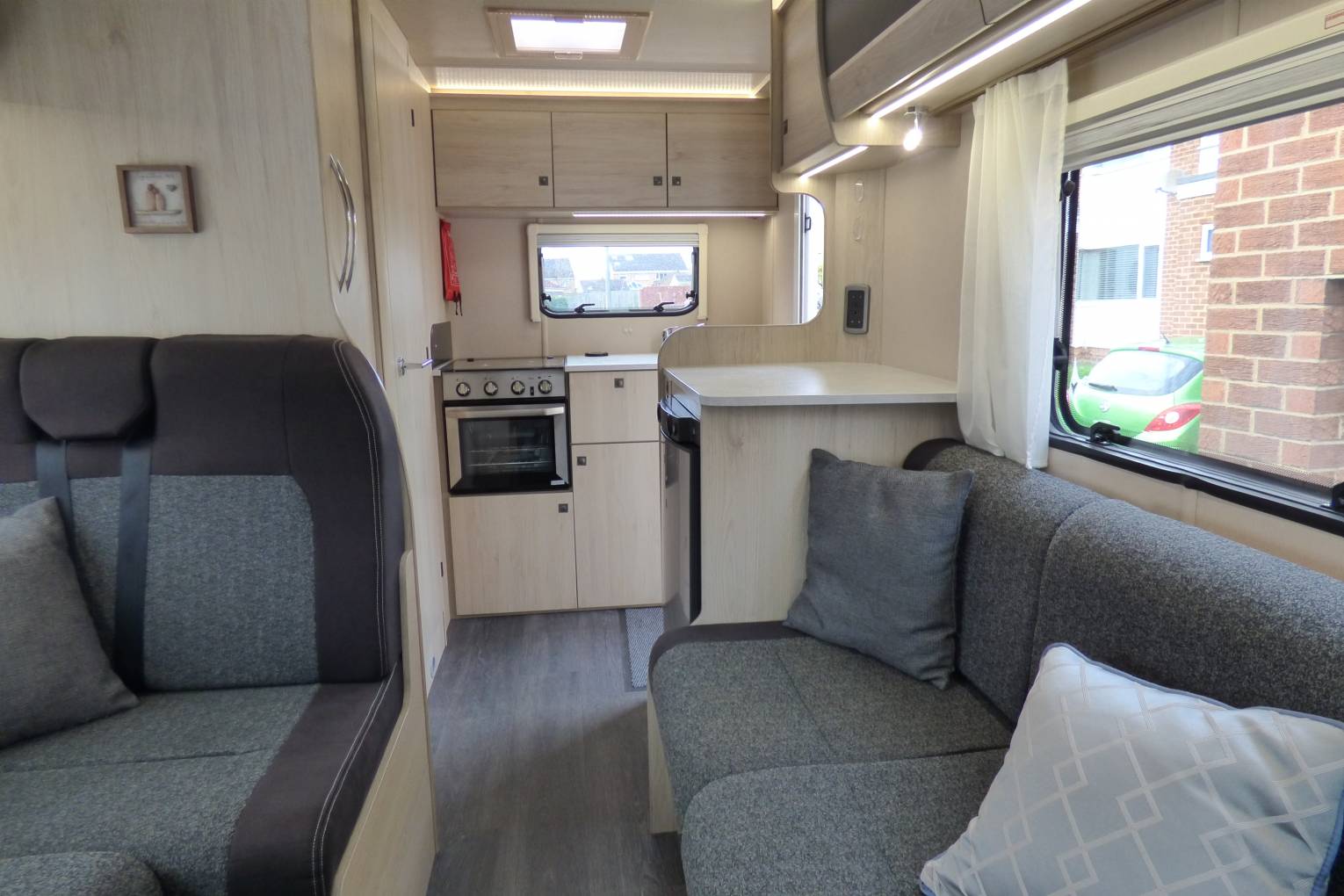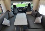 The two front seats swivel to face the lounge area with collapsible table which, in sunnier days, can be used as an outdoor table under the large wind out canopy. The kitchen area at the rear of the vehicle has a combined oven and grill, fridge with freezer compartment and sink with mixer taps. A freestanding microwave oven is also provided.