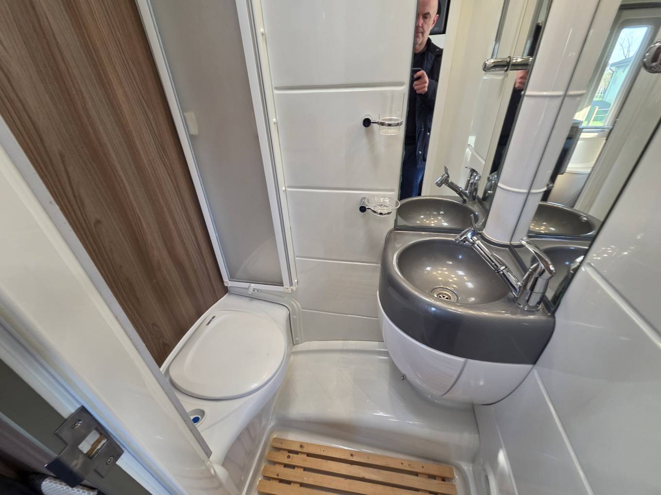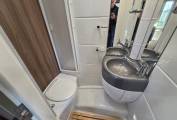 Moving to the rear there is the kitchen with a 3-burner gas hob, one electric hob, oven and grill, a microwave, sink and mixer tap, three-way fridge and loads of work surface and cupboards. In the spacious washroom/toilet there is a cassette toilet, a shower with bi-fold shower door, a sink and a vanity unit with mirrors. At the rear of the motorhome is the huge U shape lounge that transforms with ease into a large double bed.