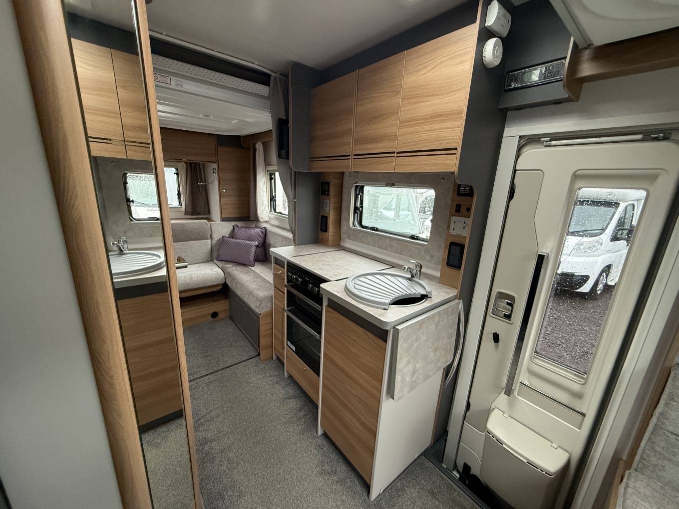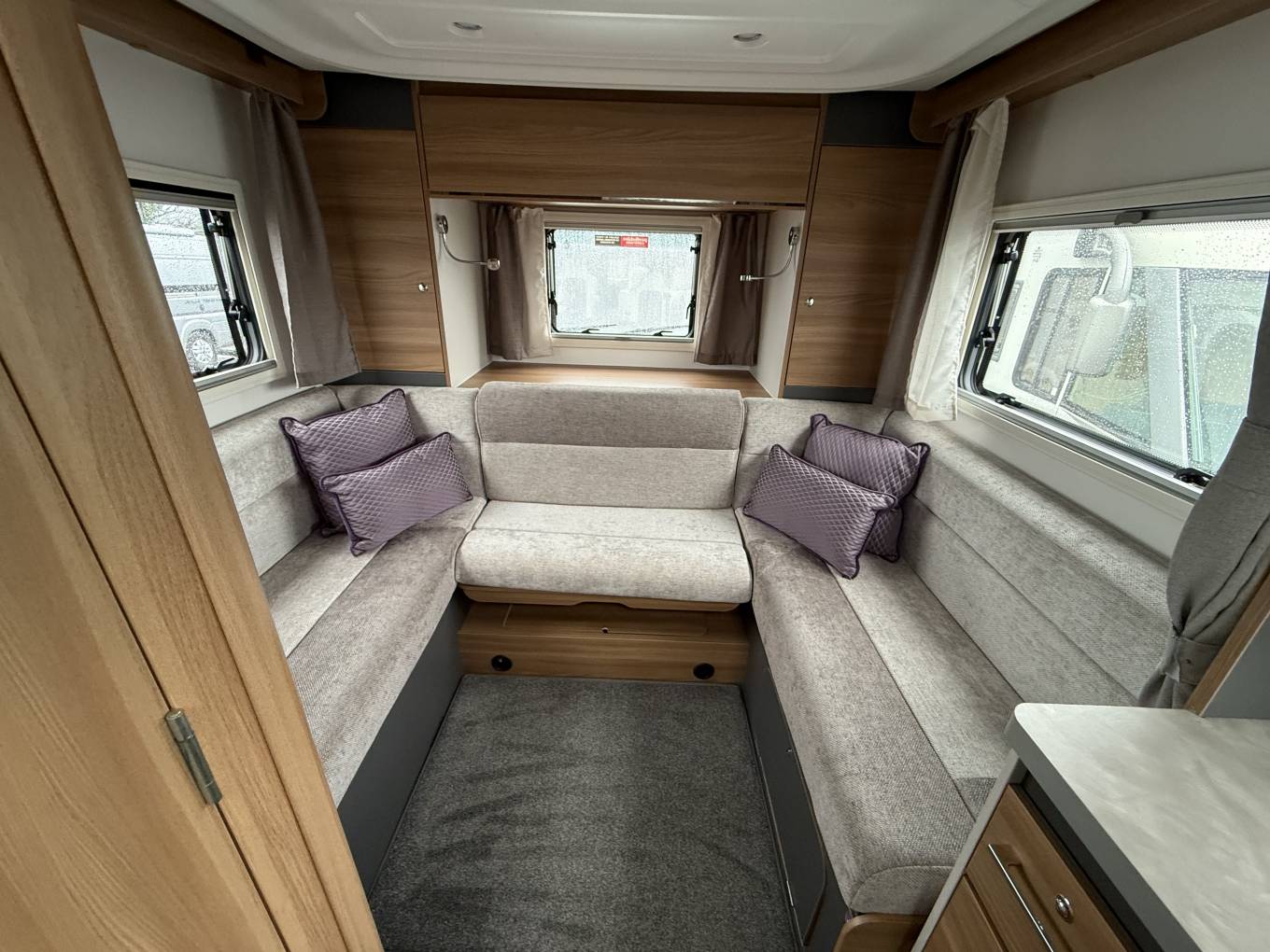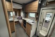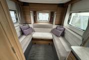 At the rear is a U-shaped lounge which also can be made up into a large double bed and has a wardrobe in each rear corner, one of which can be accessed from the outside. There is an Avtex Smart TV tucked away which can be viewed in this area. Over each lounge area is a double drop-down bed so there is room to sleep 8 in total.