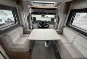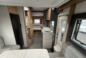 The layout of this impressive motorhome is on entering the habitation door on the nearside there is a dining area/lounge to the left with 2 swivel seats, a dining table and 2 forward facing passenger seats concealed below the opposing settees which can be made up into a double bed. The cab has a large roof vent above and there are integral cab blinds to the windows. Opposite the door is a large fridge with a freezer box and drawer within its base. Next comes a smart modern bathroom with toilet, washbasin and shower. You then have the well-appointed kitchen which has a full oven and grill, hob with 3 gas burners and an electric plate and a sink with an extra flap to form more workspace.