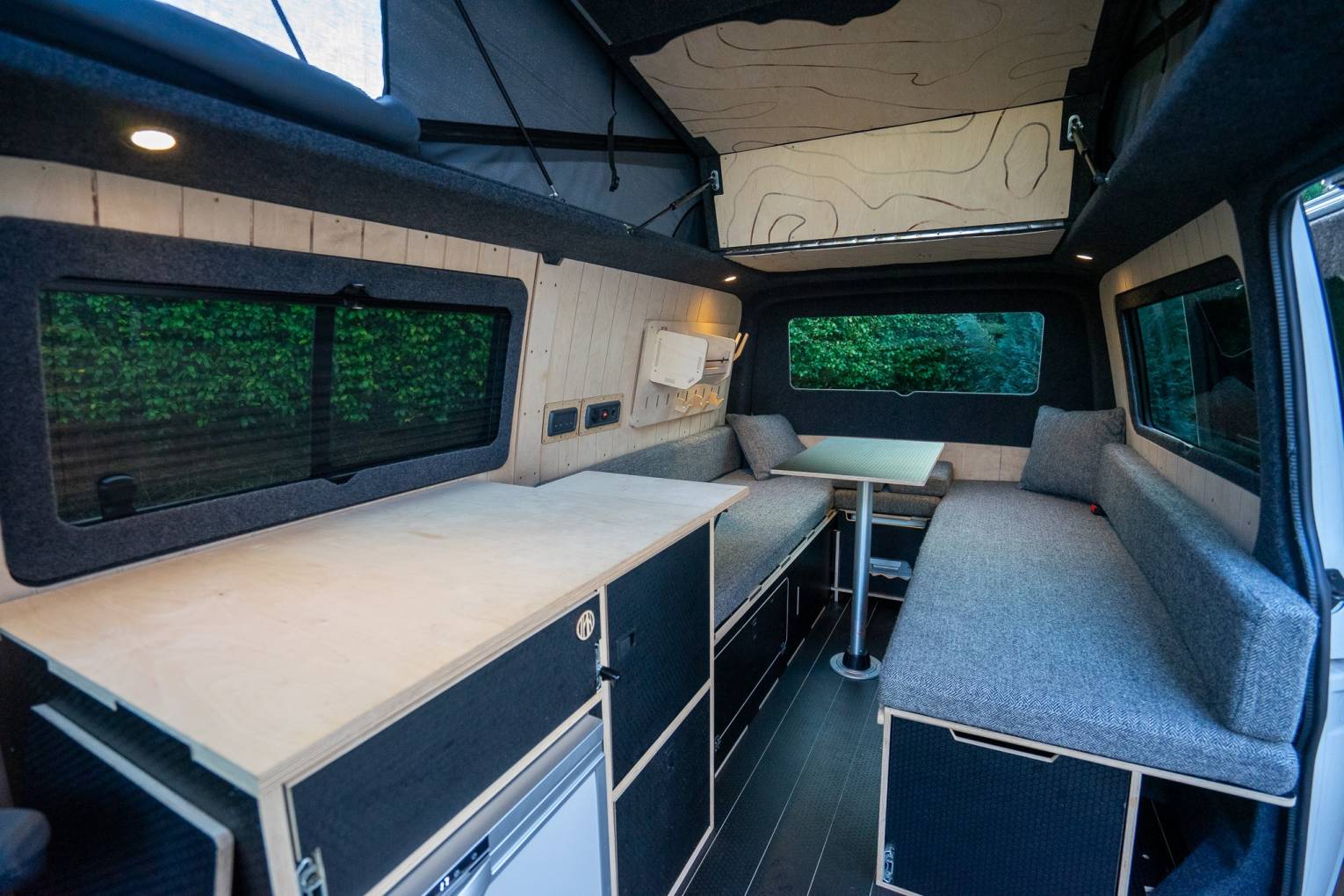 Forget the standard rock-and-roll bed; the rear of this van features the highly coveted Ply Guys U-Shaped Lounge. Crafted from beautiful, sustainable birch ply, this setup completely changes how you use the van.
