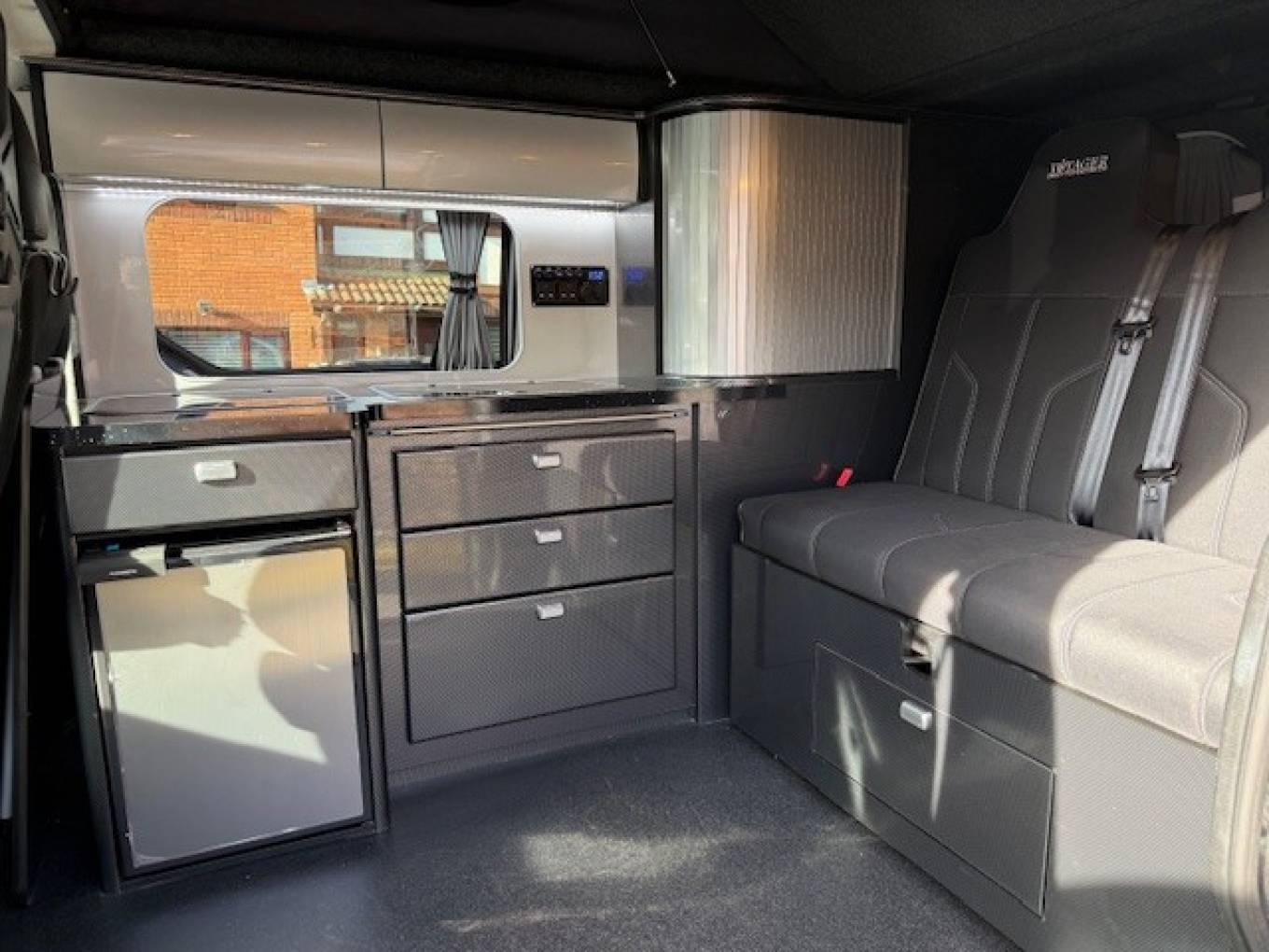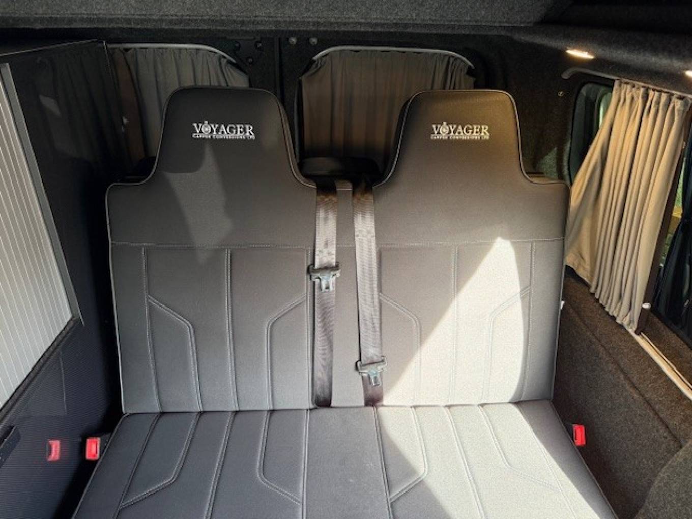 This Voyager Conversion is a 4 berth 5 seat belt model , with a Drop down rock n roll bed. Scenic poptop roof with roof bed. DOMETIC crx50 compressor fridge. Smev 8005 sink with running water. Smev 8022 twin gas hob. Camping Gaz bottle enclosed in gas locker. Altro flooring. Led lighting. Sterling battery to battery charger. Leisure battery. 240v hookup. High gloss grey luxury curved furniture unit . Sidesteps. Privacy glass throughout. Curtains. USB sockets.