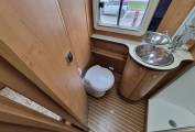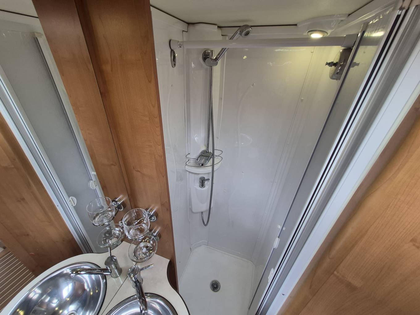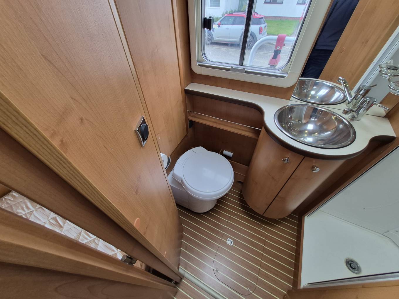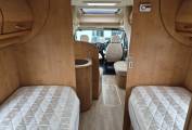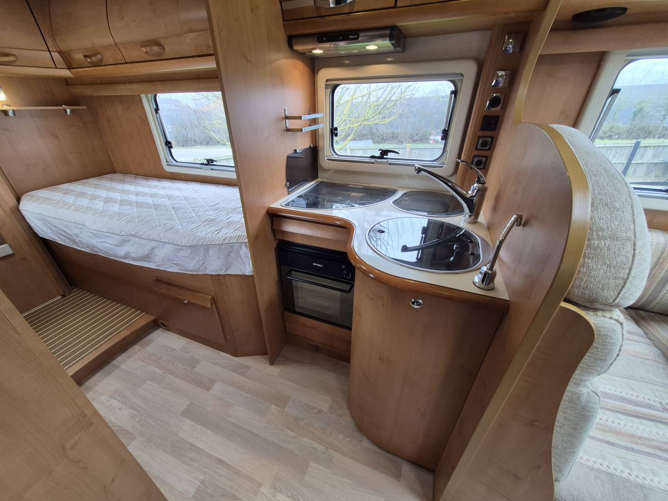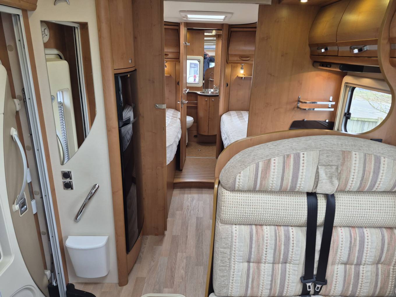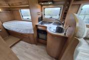 At the rear is the full width washroom, with SOG toilet, stainless steel sink, separate shower enclosure and good storage space. The bedroom area has two fixed single beds with storage underneath and a range of overhead lockers. There is a sliding door to close the bedroom and washroom off from the rest of the living area.