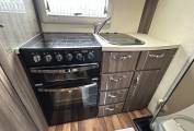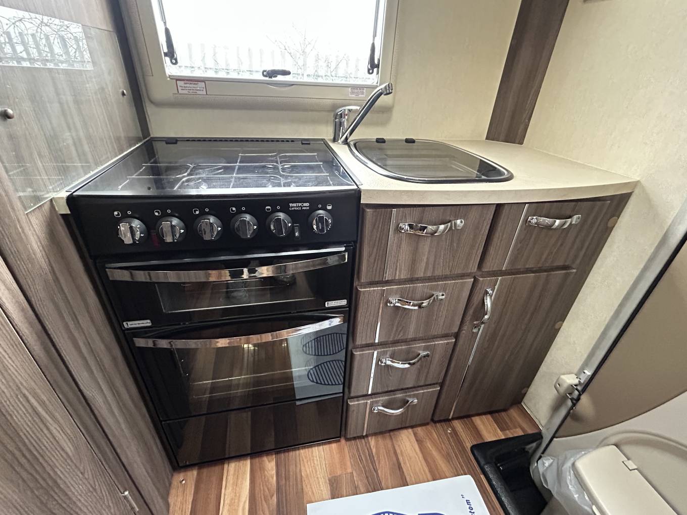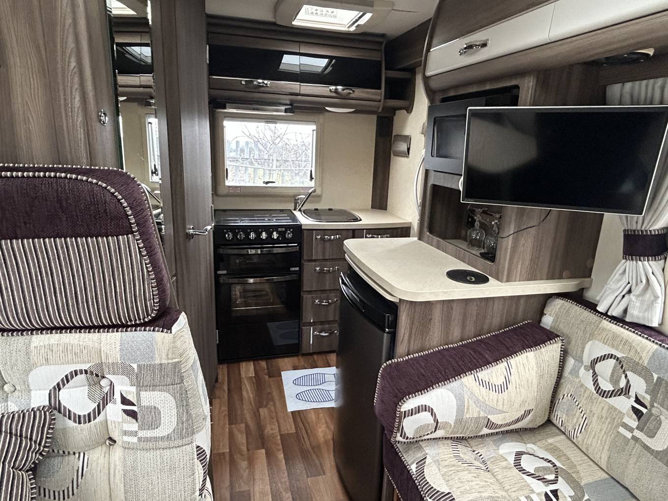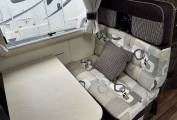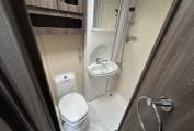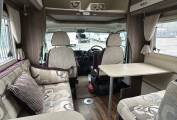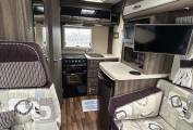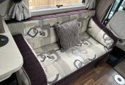 The interior is bright and welcoming, featuring a centre lounge that converts into a comfortable double bed, along with an additional overcab bed for flexible sleeping arrangements. The well-equipped kitchen includes a ThetfordCaprice MkIII oven and grill, microwave, fridge, and extractor fan, making it ideal for cooking on the road. The washroom is neatly designed with a Thetford toilet, ensuring convenience wherever your travels take you.
