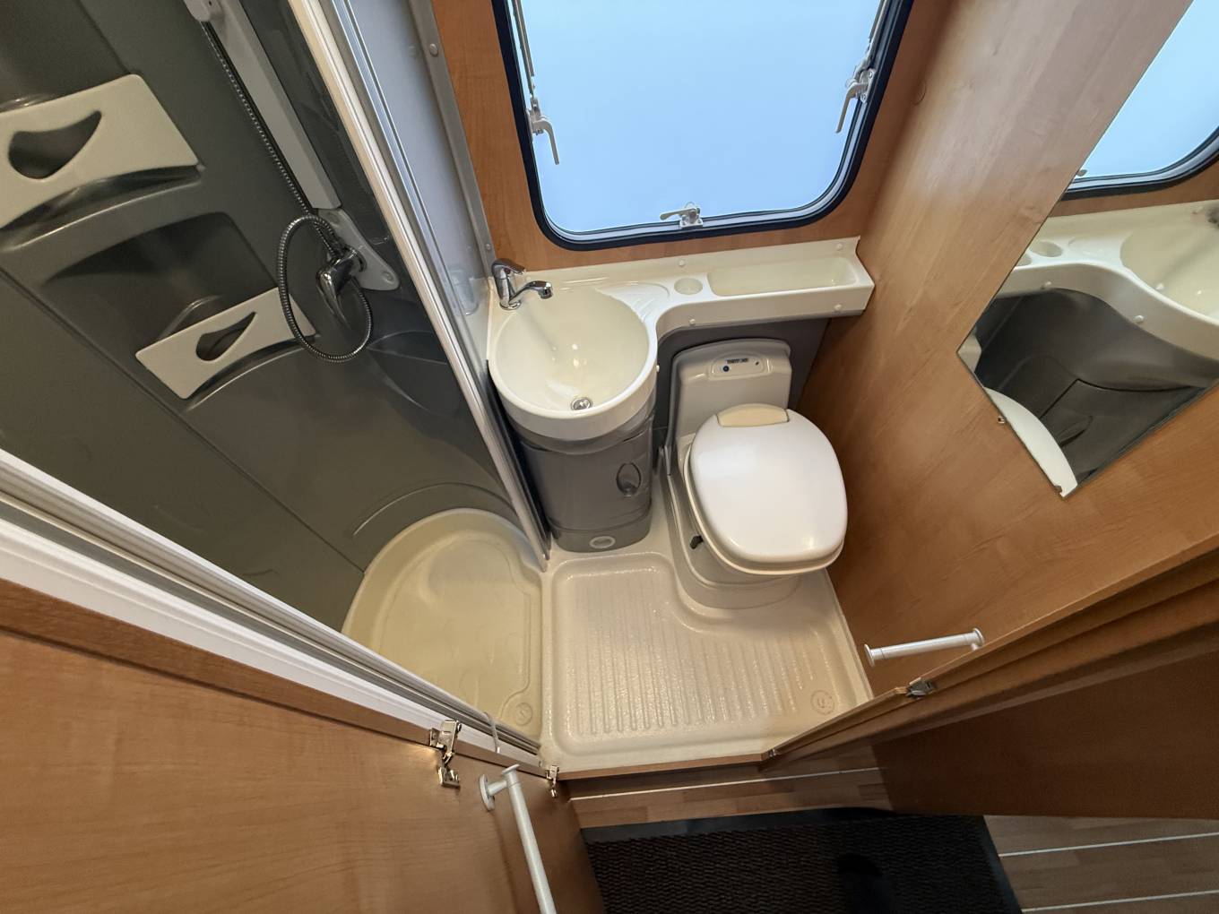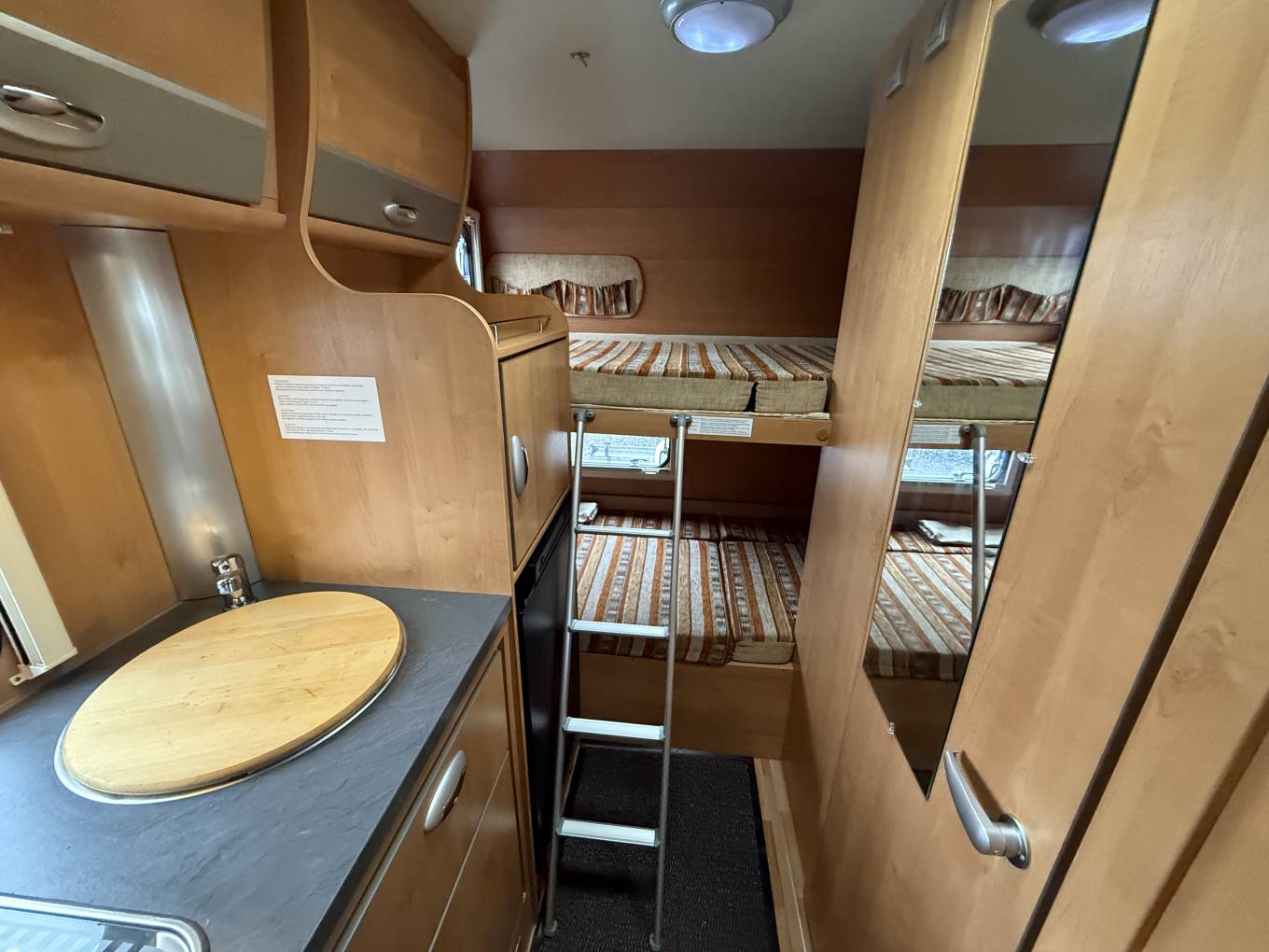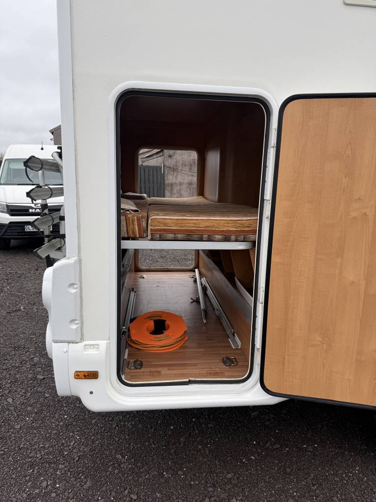 The kitchen has a round stainless steel sink with chrome mixer tap, a 3 gas burner hob with glass lid, a Duplex oven and grill, plus a Thetford 3-way powered fridge with freezer box. There are upper lockers, lower cabinets and drawers to store away all your holiday provisions. The washroom has a round wash-basin with chrome mixer tap, a separate shower cubicle with folding perspex doors and rising rail with shower handset, plus a Thetford cassette toilet with electric flush. At the rear there are the two bunk beds, the upper bunk is accessed by ladder, both have windows, reading lights and privacy curtails. The bottom bunk raises to reveal a large storage garage where you could place a lot of equipment whilst travelling.