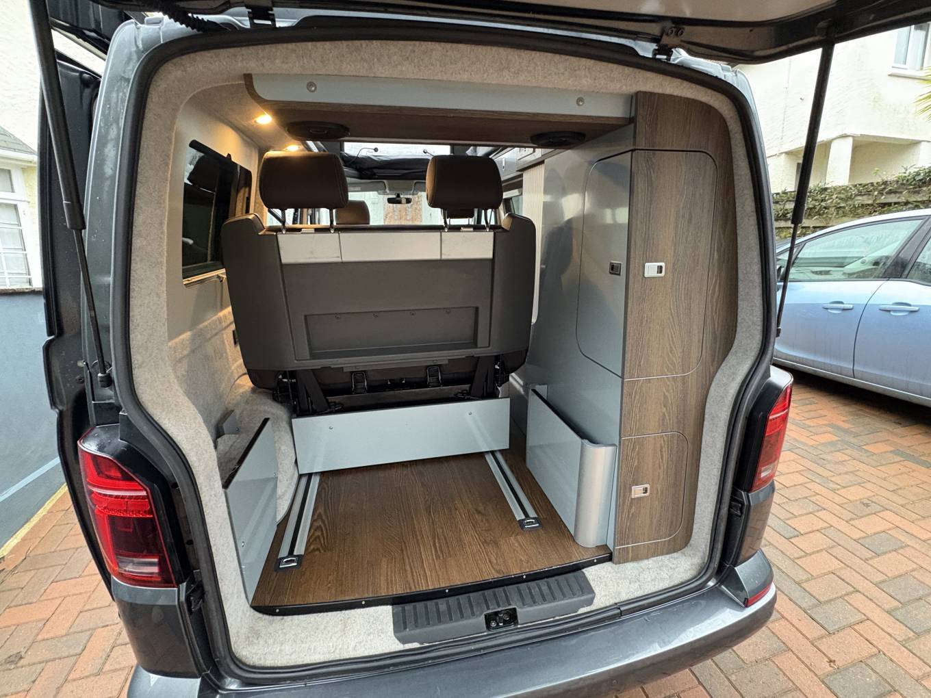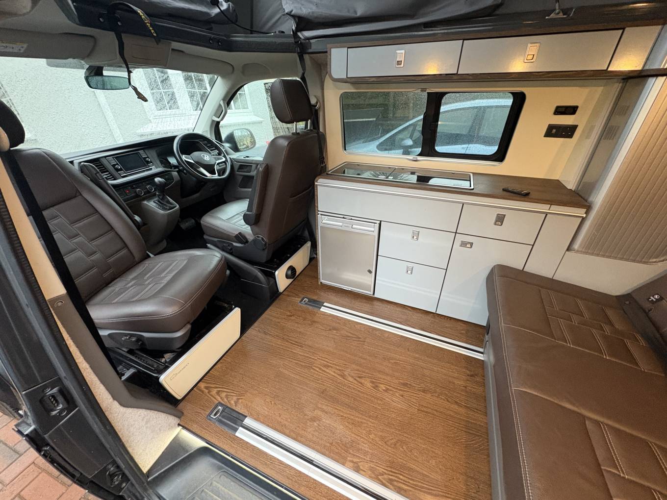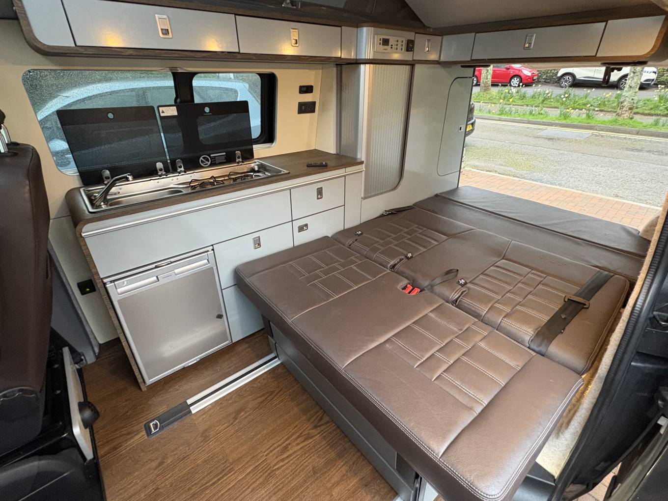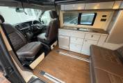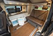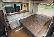 The spec on this VW really is up there with the best and you also have the control of the lights via a remote control which is another lovely feature. Both the seats in the cab area also swivel to the habitation area and the bed in the rear is on runners which enables flexibility for the storage space at the rear. You also have storage cupboards above the kitchen area and at the rear of the camper.