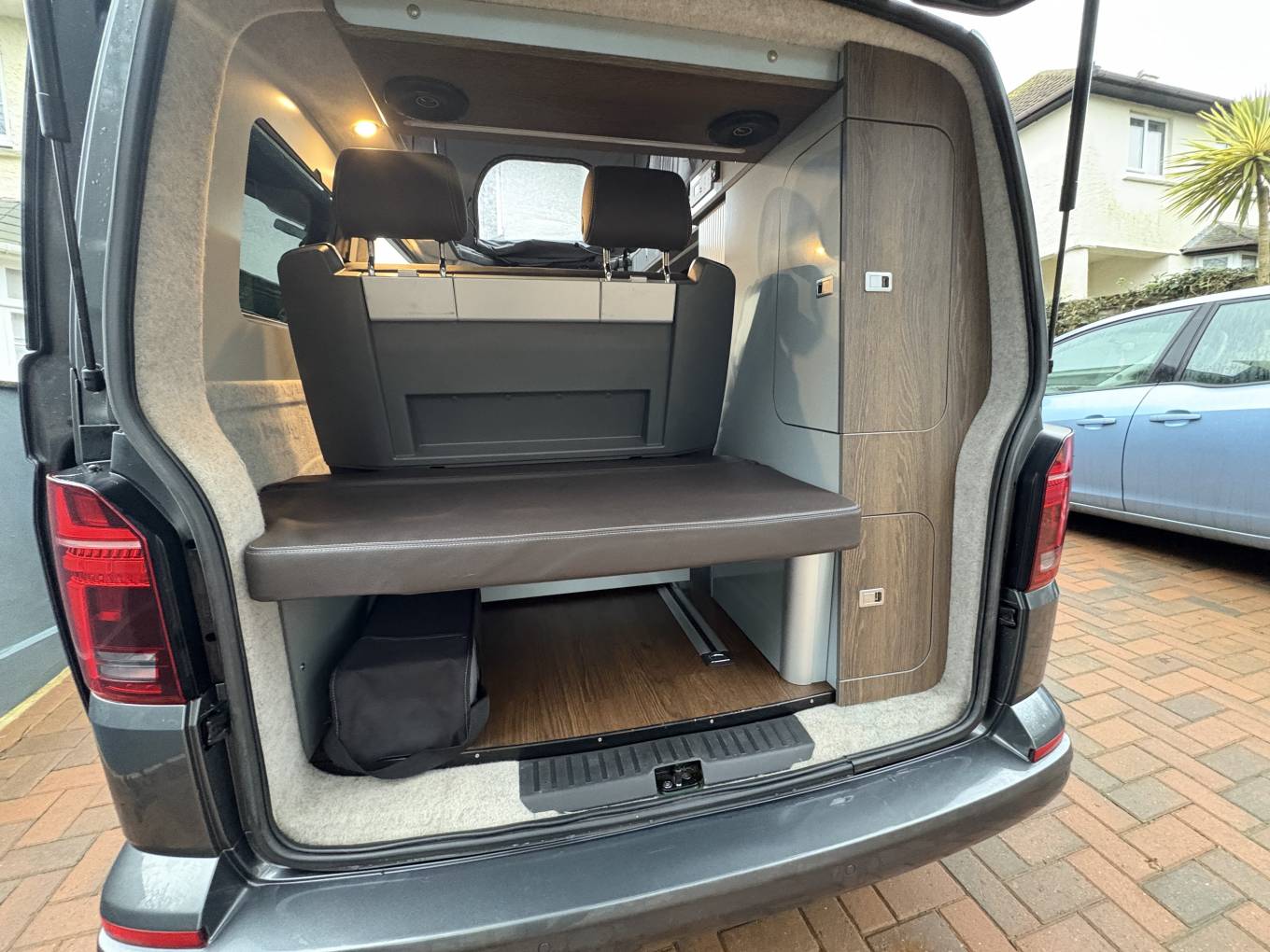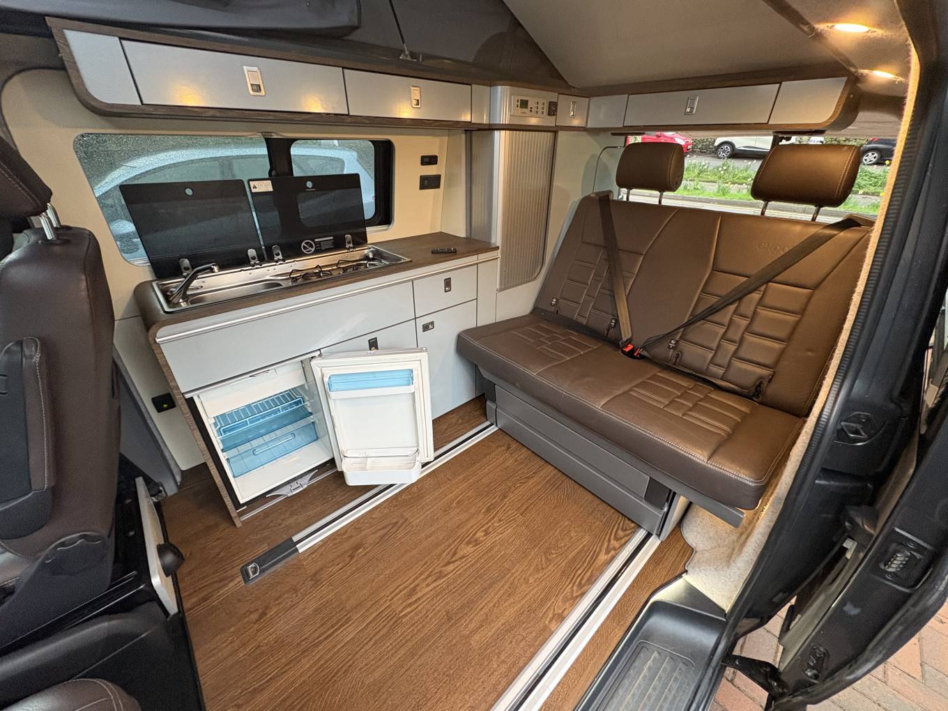 The seats are all leather and the inside of this camper has been well cared for and comes with all the desired features that people look for in a VW which include; Diesel Heating, Solar Panel, Cab Air Con, USB Points (also USB ports in the Pop Top), Pop Top Reading Lights x2, 240 Electric Hook Up, x2 Swivel Seats, Thule Wind out Canopy, 2 Sets of Keys, Bluetooth and Phone Connect, Rock and Roll Double Bed, Pop Top Roof, Gas Hob Rings x2, Cold Water Sink, Large Table for inside stored away in the side door, Parking/Reversing Sensors, Electric Windows and Mirrors, Speakers in the Front and Rear, Underslung Gas Bottle which is easy to fill when needed (very rare on VWs), Levelling Chocs, Hook Up Cable, Central Locking, Iso Fix seatbelts in the Rear, Spare Tyre, Cruise Control and Owners Manual.