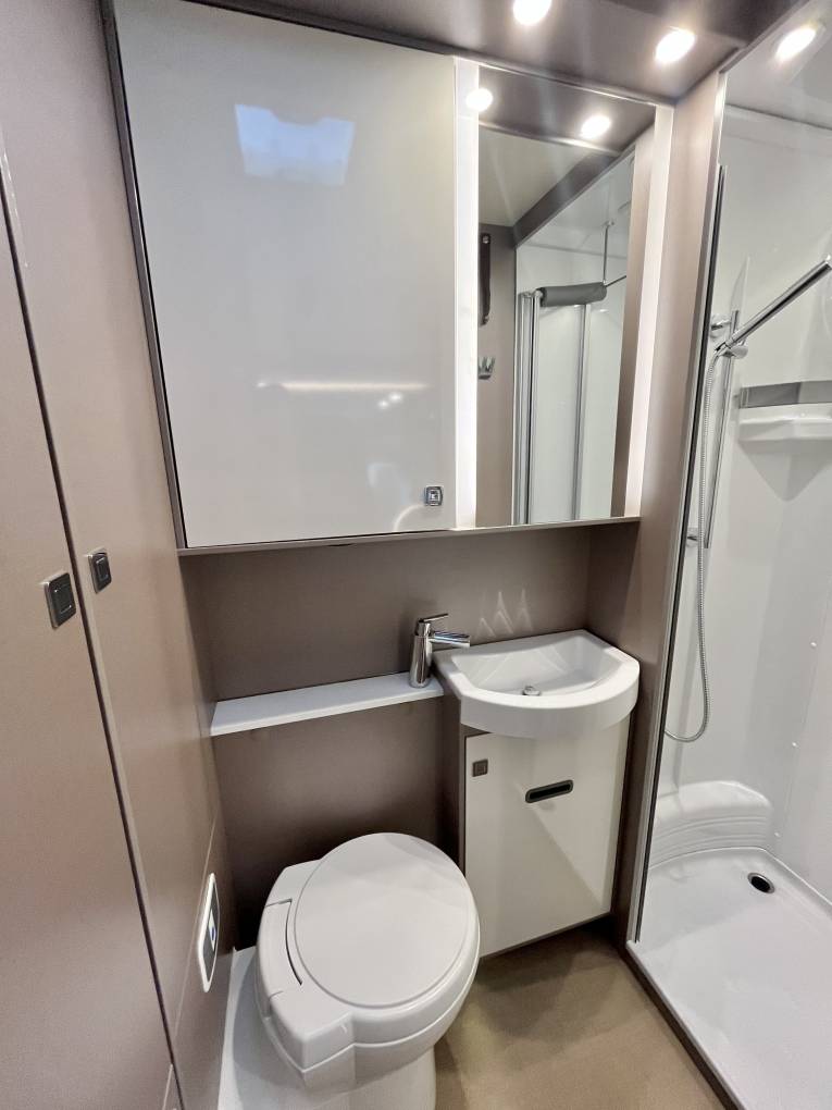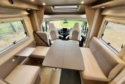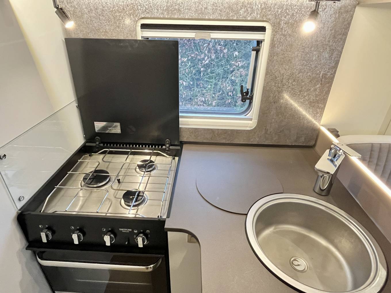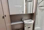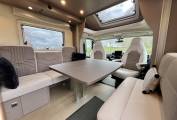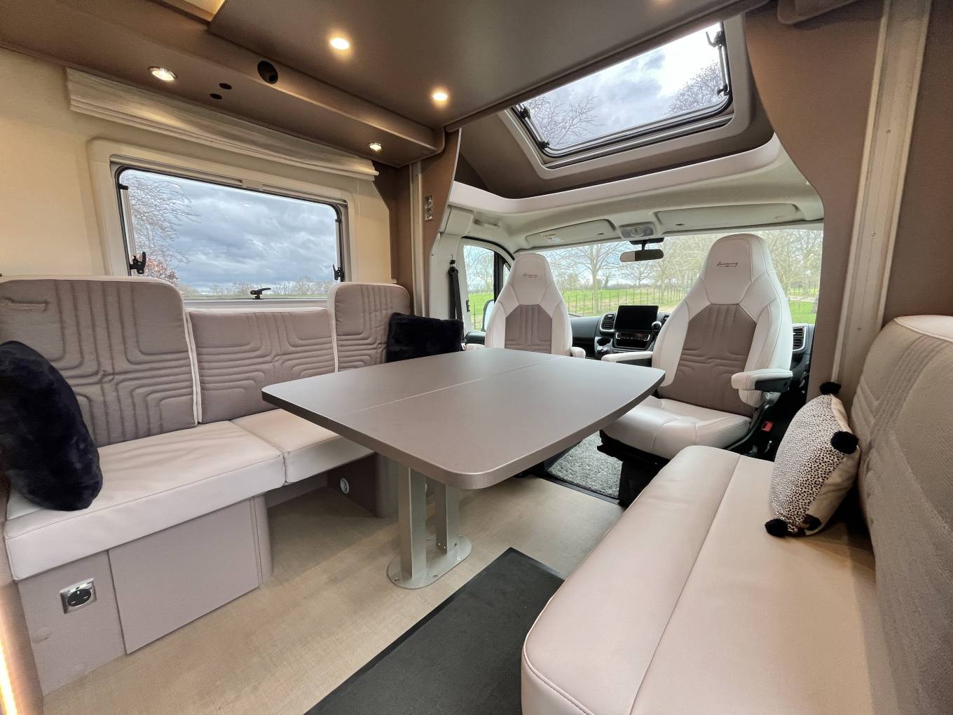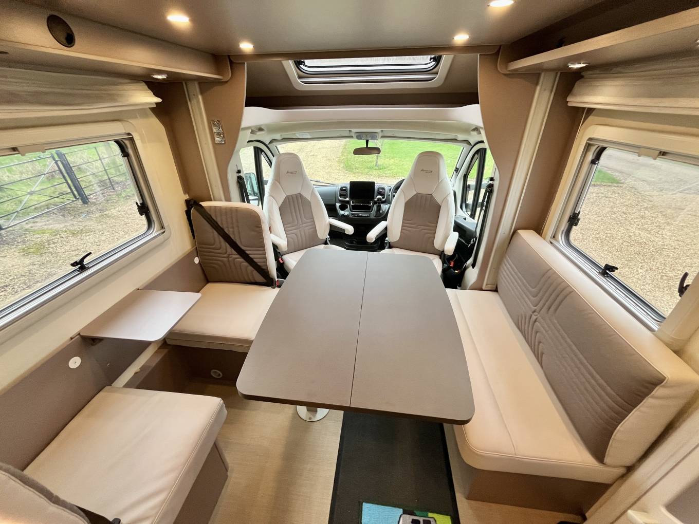 The kitchen area is well equipped with a sink, oven, three gas hobs, and a tall fridge with freezer compartment, while the front dinette provides a comfortable place to dine and relax, the near side lounge bench can be converted into two additional travelling seats with a folding occasional table between. The large central table can be also lowered to make a good sized sleeping area in the lounge when required and there is a large electrically operated drop down bed above. Interior comfort is further enhanced by habitation air conditioning, a Truma heating and hot water system keeps the interior cosy all year round, along with an Avtex TV & Soundbar and 4G Wi-Fi.