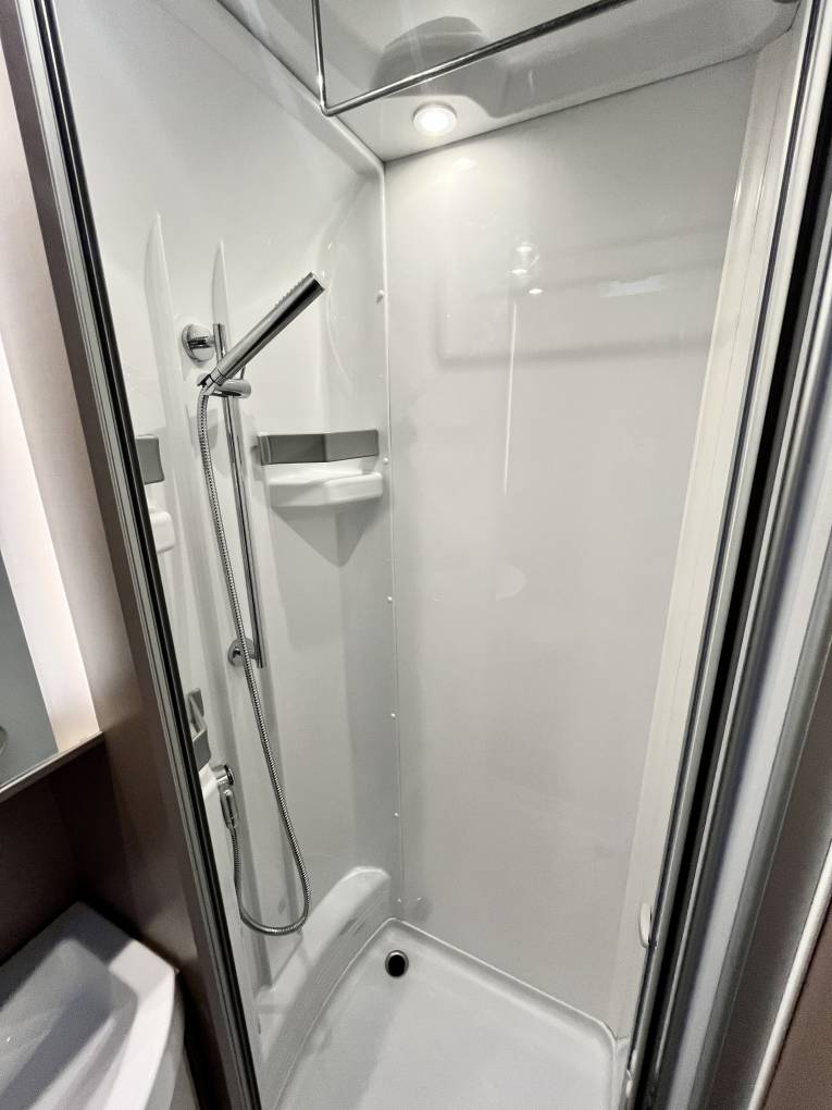 Inside, the layout has been designed with comfort in mind, at the rear there’s a full width washroom/shower room, complete with a sliding tamber door for separation. The washroom facilities are very convenient, with the toilet and sink to one side along with good storage and a very large wardrobe area and a separate shower cubicle to the other creating a spacious en-suite feel.