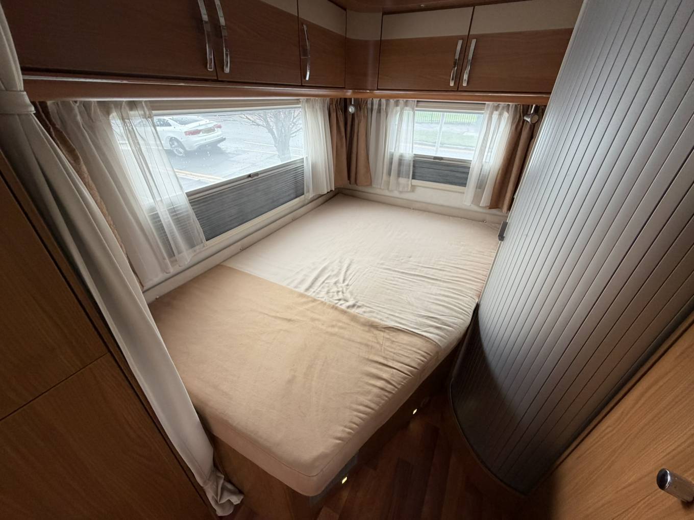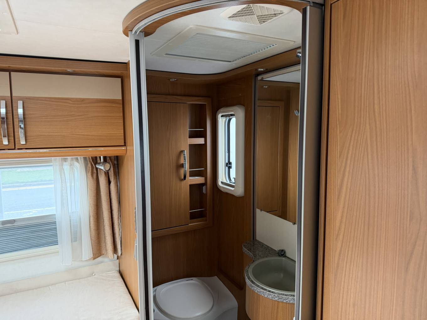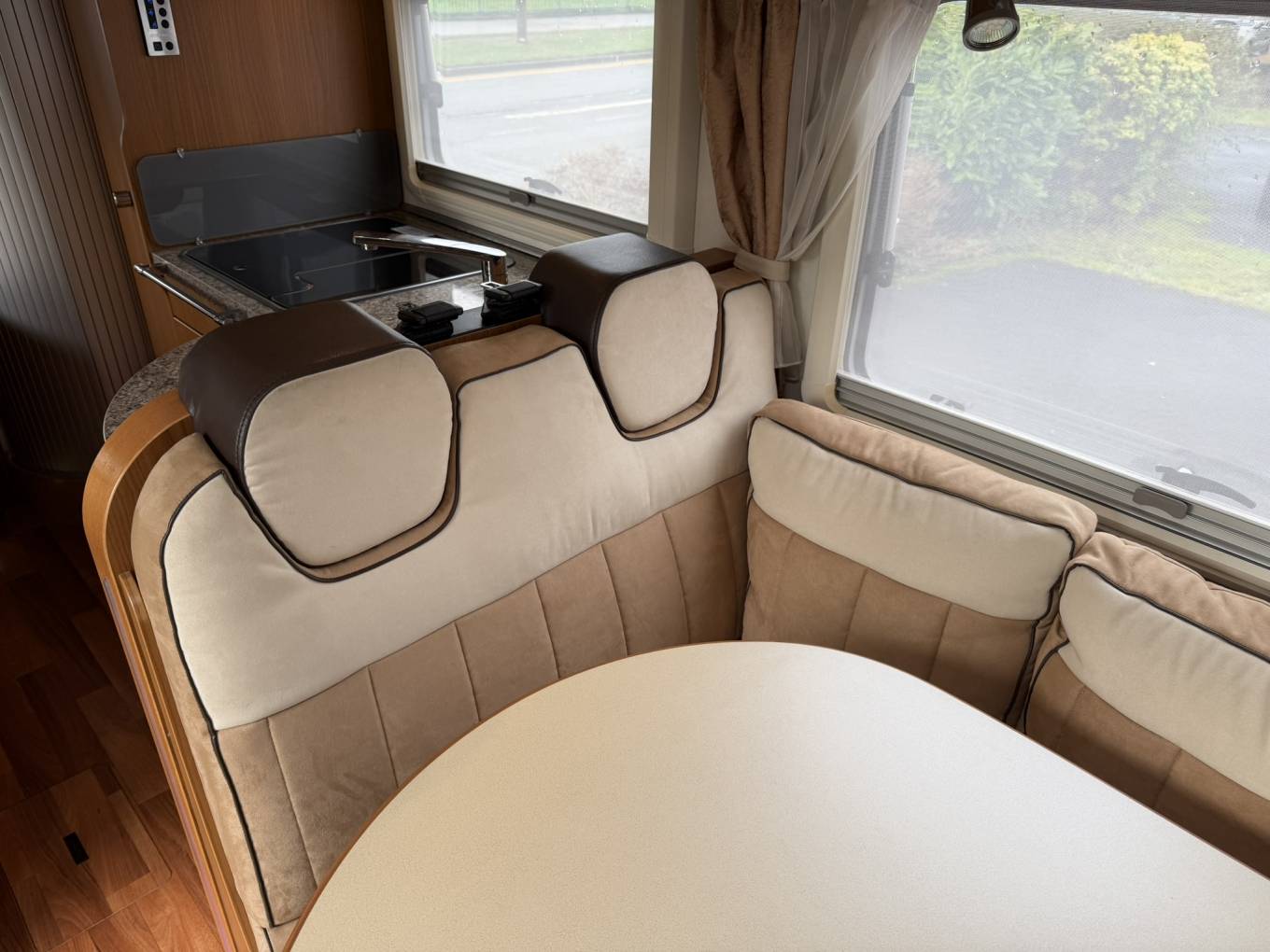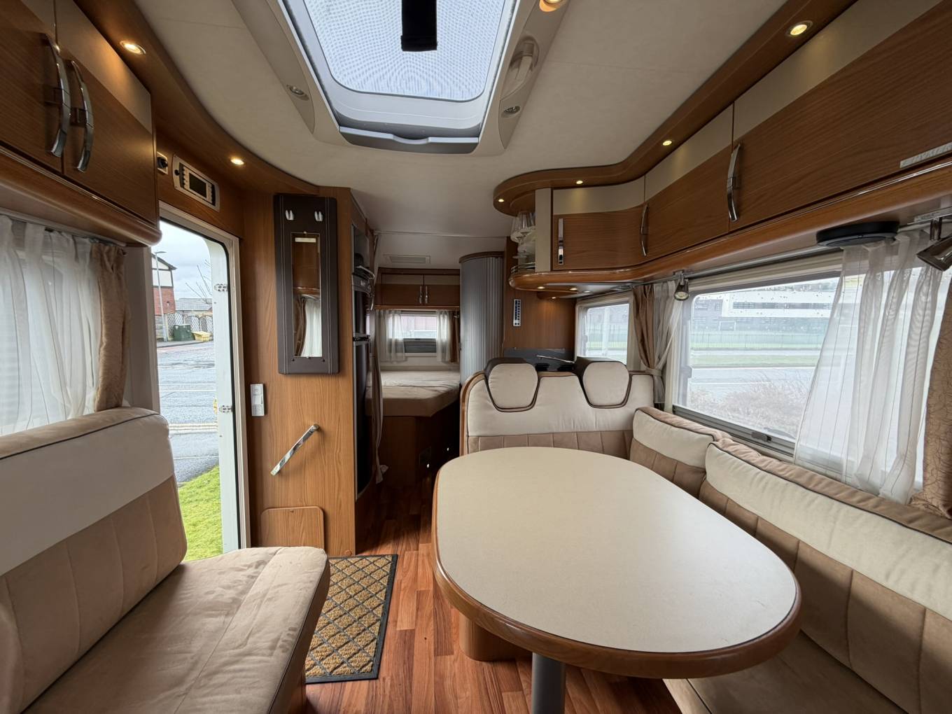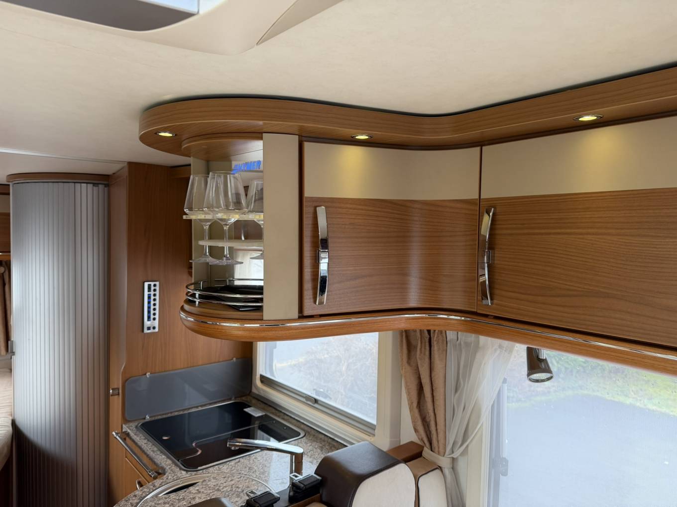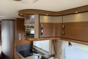 Further highlights include a full-height wardrobe, 3-burner gas hob, sink, ample worktop space and elegant curved overhead lockers with glass-fronted doors. A discreet drop-down TV is neatly integrated within the cabinetry.