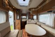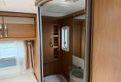 Entering via the nearside habitation door and electric step, the interior opens to a well-appointed kitchen with a large fridge and separate freezer, oven and grill, and generous storage. To the rear, a fixed double bed provides a comfortable and private sleeping area. Adjacent, the spacious washroom features a SOG toilet system and a clever swing-wall design, creating a luxurious, full-size shower space.