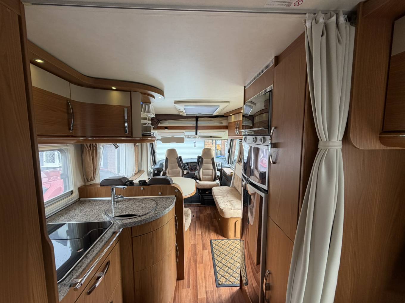 A rare feature for an A-Class, the driver’s side cab door provides effortless access to the refined cab area, complete with fully swivelled captain’s seats. The large front double bed lowers seamlessly, offering exceptional convenience.