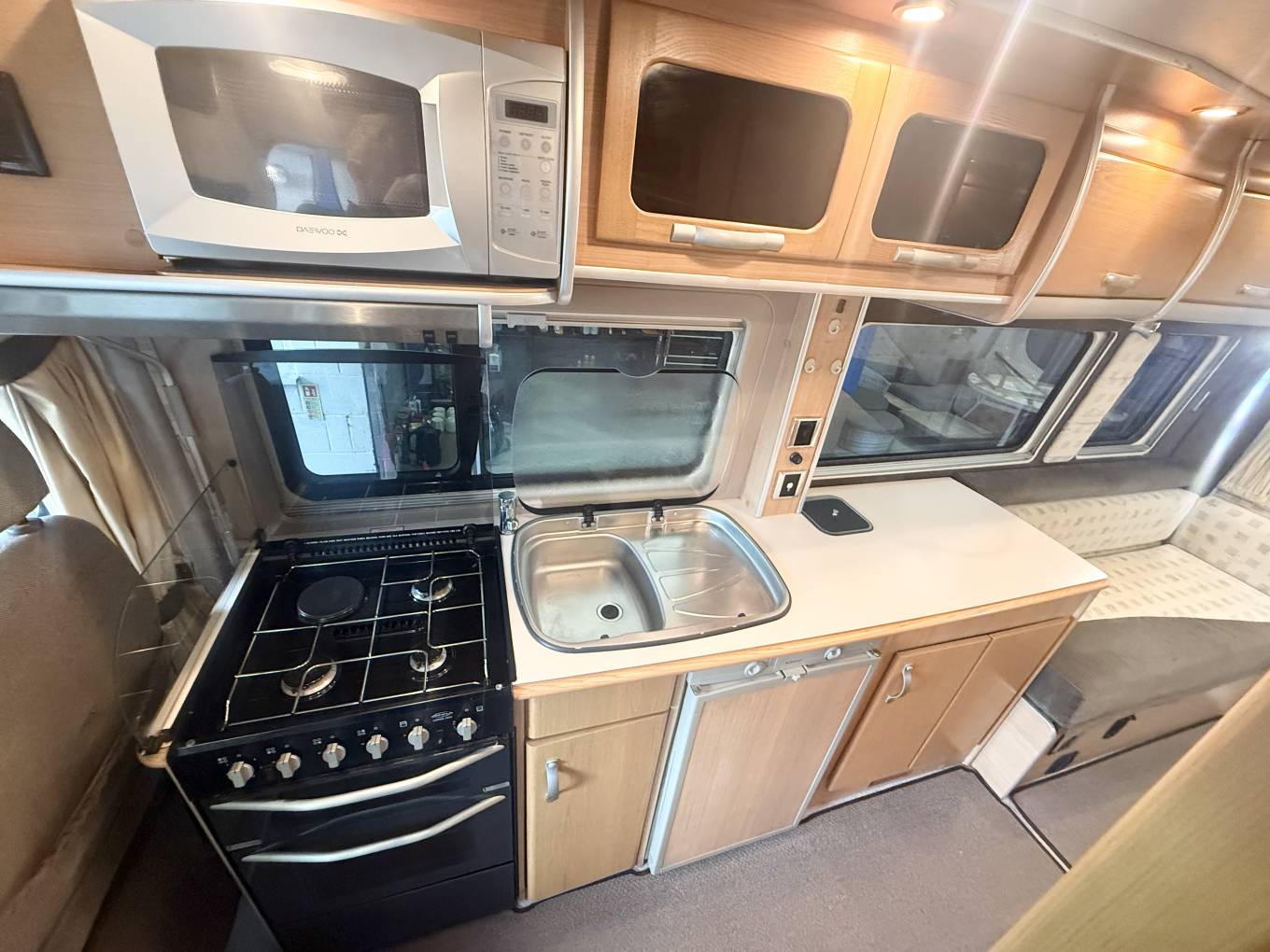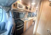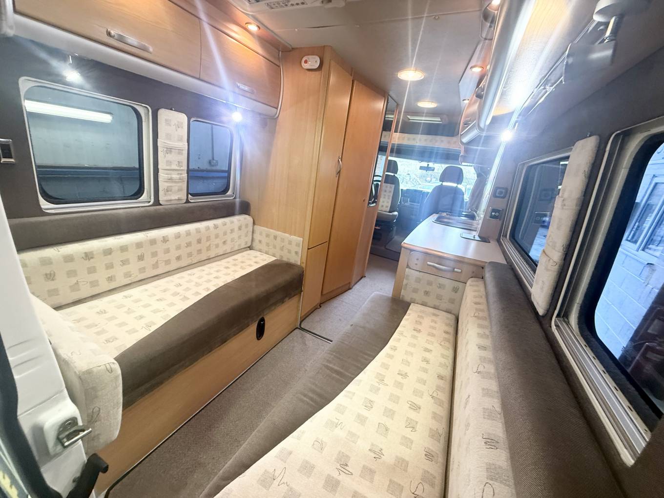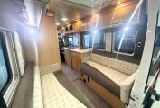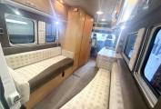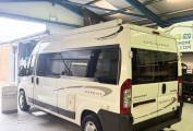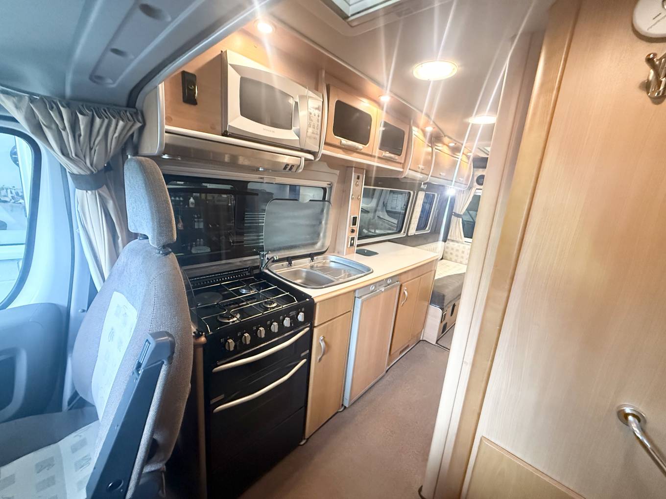 Upon entering the vehicle on the nearside sliding door, you are greeted with access to the cab with 2 belted seats, washroom to your right and the kitchen in front of you, leading to the comfortable rear lounge. This vehicle is the ultimate compact 2 person vehicle, and all the comforts of home, yet easy to park and navigate round country lanes. There is also plenty of storage space to house all your clothes, bedding and equipment. The rear lounge has a cosy feeling, benefitting from comfortable fabrics and the level of finish set this motorhome apart from others in its class. The central kitchen comes complete with oven, hob, fridge/freezer, microwave and sink/drainer. Opposite the kitchen area is a well equipped washroom with shower, Cassette toilet and wash basin. Above the shower is a roof light which gives extra ventilation and light. Curtains and blinds fitted in the body of the vehicle. Once inside, you can't help but notice the full run of windows down the side of the vehicle - making it feel really open, yet from outside the tinting provides privacy.