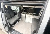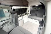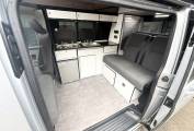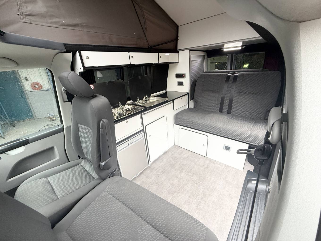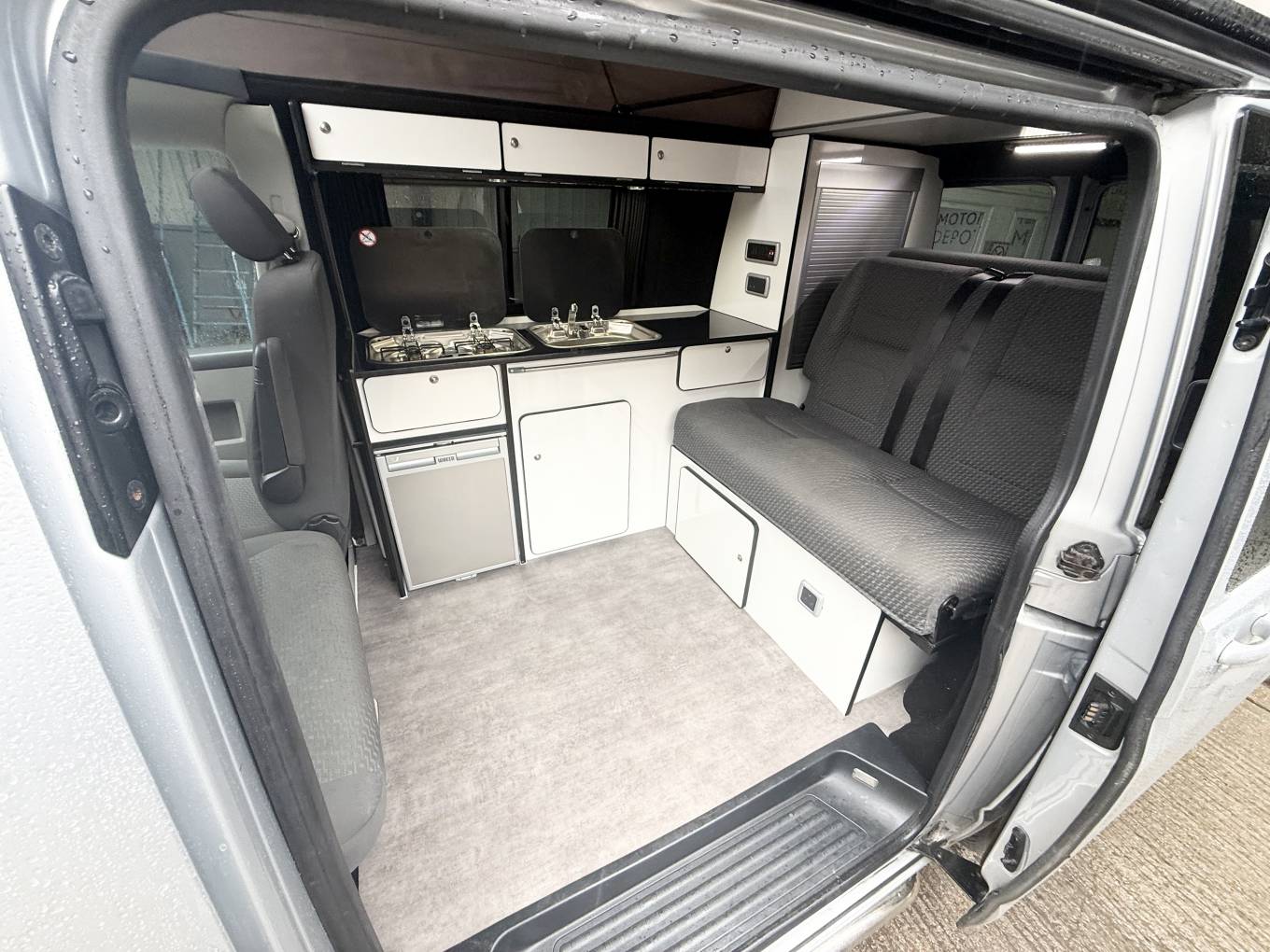 The Rock n Roll bed fitted in the rear and pop-top roof allow for 4 berths comfortably so there is plenty of sleeping space. There is a compressor fridge and a diesel heater situated in the front where there is also a fold away table to form a dinette when needed. At the back there is a kitchen with a sink and 2 gas hobs.