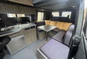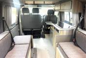 This quality conversion offers a 4 berth sleeping capacity along with 7 travelling seats. The cab which boasts 3 of the 7 travelling seats also has the popular swivel plate so the front passenger seats can turn to face the centre dinette and the remaining 4 travelling seats. In the Cab there is air conditioning, a radio, CD player, cruise control along with electric windows and mirrors.