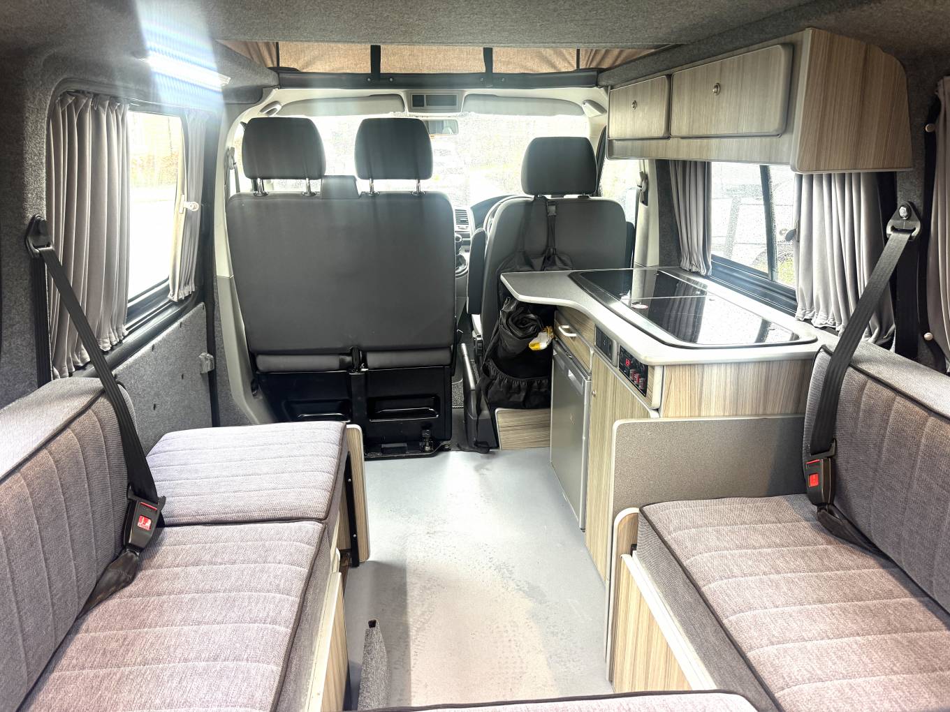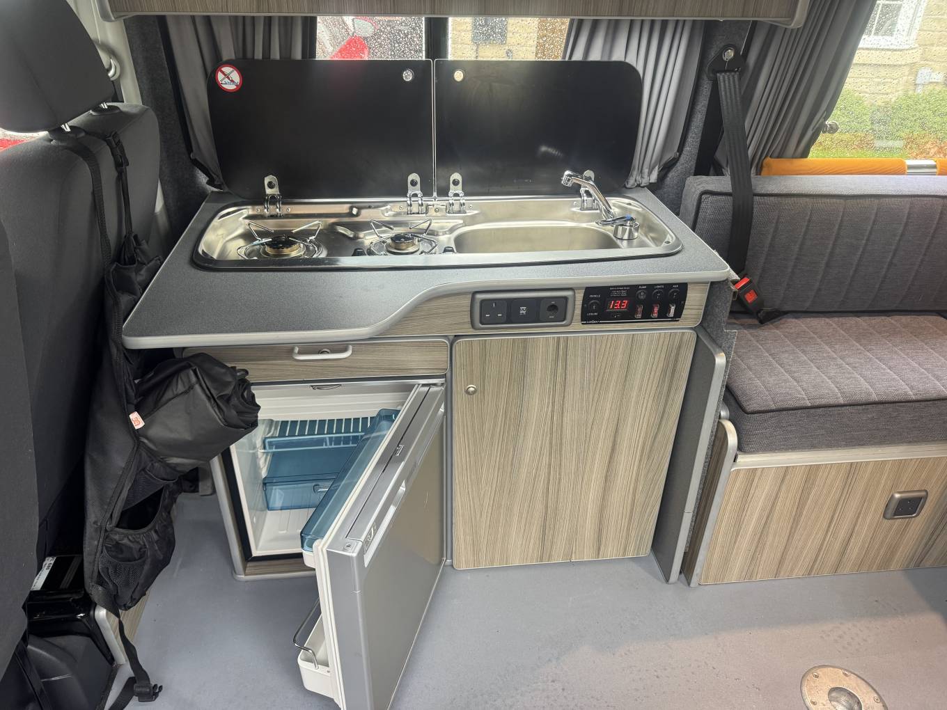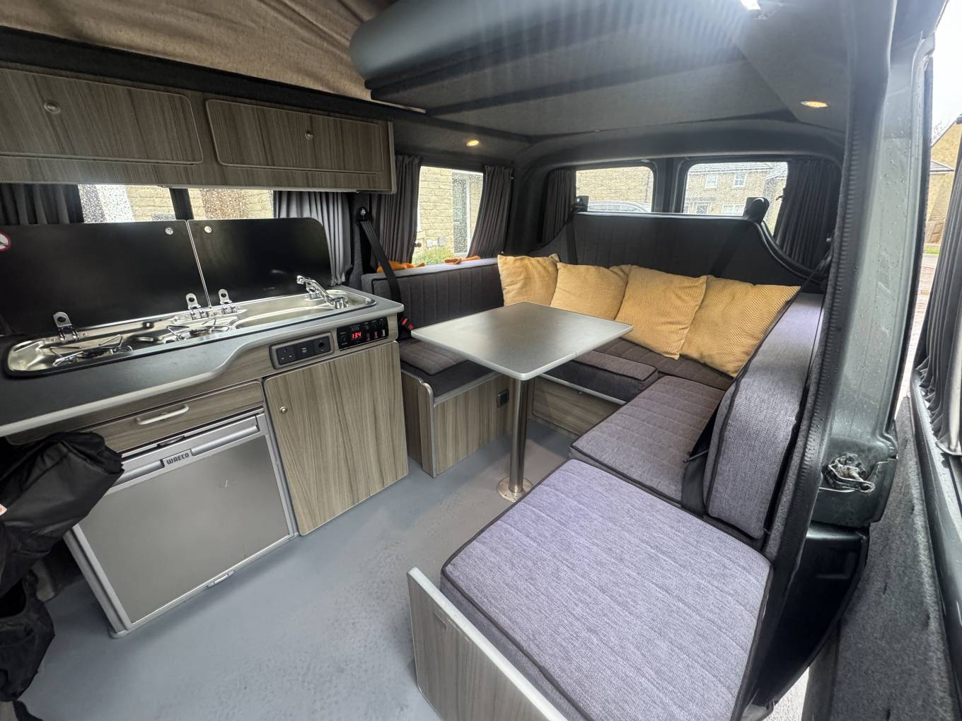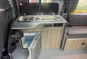 The centre dinette includes a 2 ring gas hob supplied by the gas bottle located underneath in the cupboard. There is also a sink and a good sized fridge with freezer compartment and a dining table which is well positioned between all 7 travelling seats.