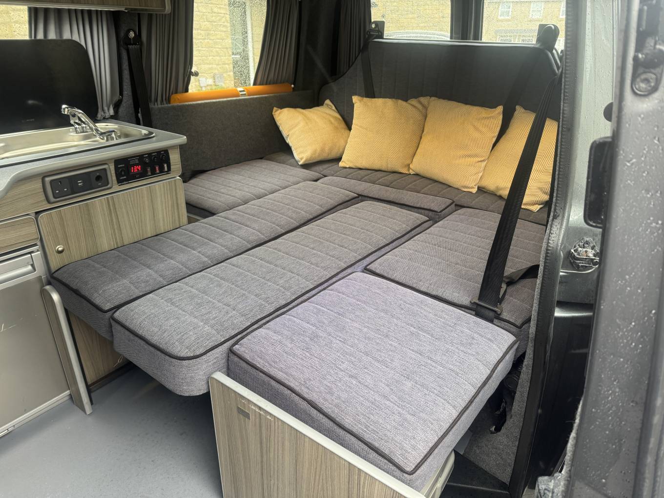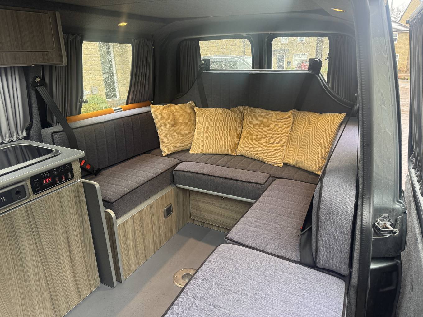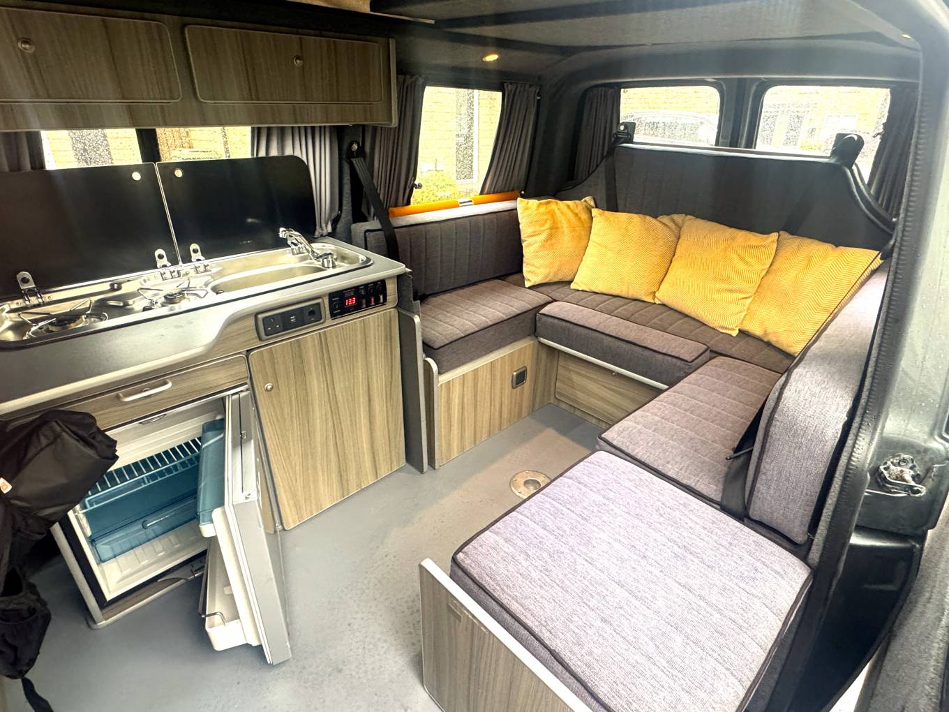 This camper has a very unique rear lounge U shape layout which also converts to a large double bed with plenty of storage space underneath. Above this in another double bed inside the pop top roof. Around the Camper there are several drawers and storage cupboards so you are never short of space.